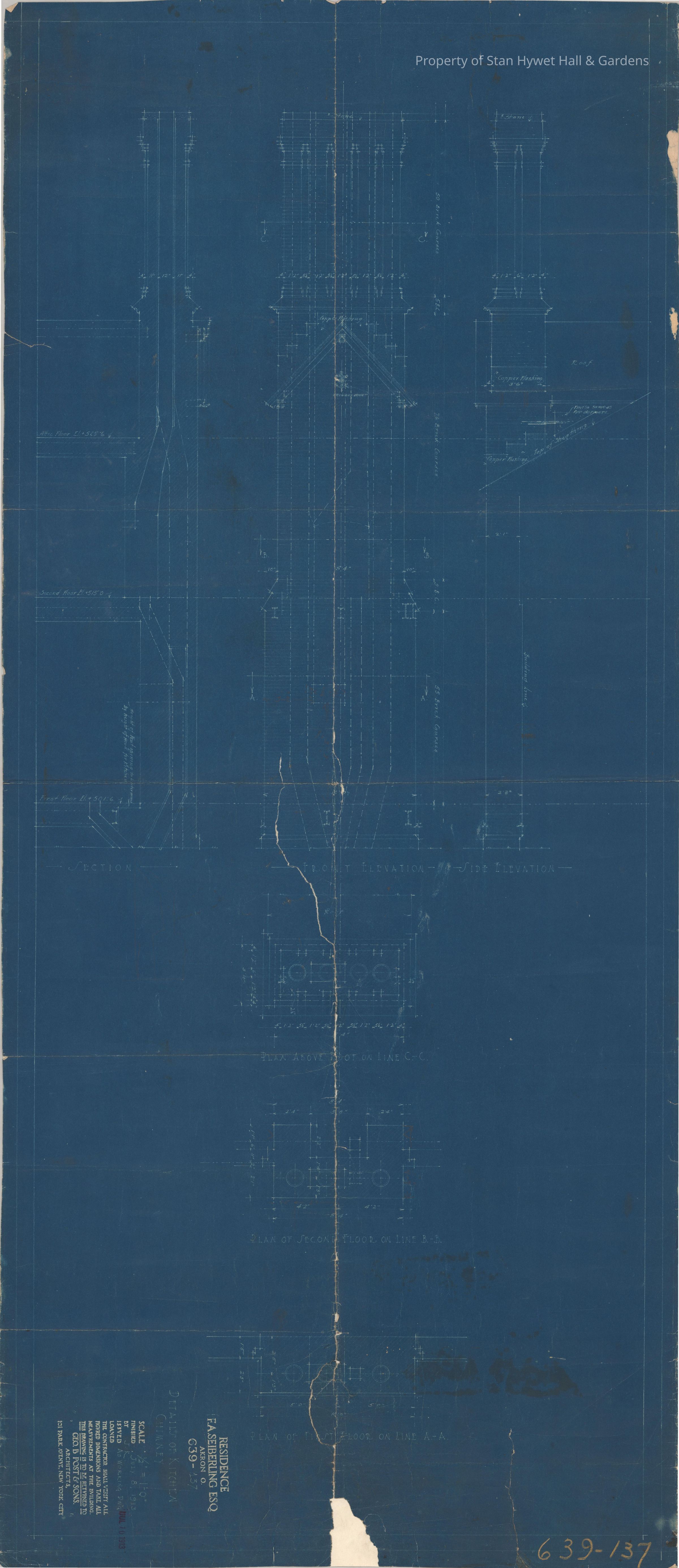 Historic blueprint: Detailed drawing of several elevations of the Kitchen chimney and plans of the chimney from different floors of the house. Titled "Details of Kitchen Chimney".
