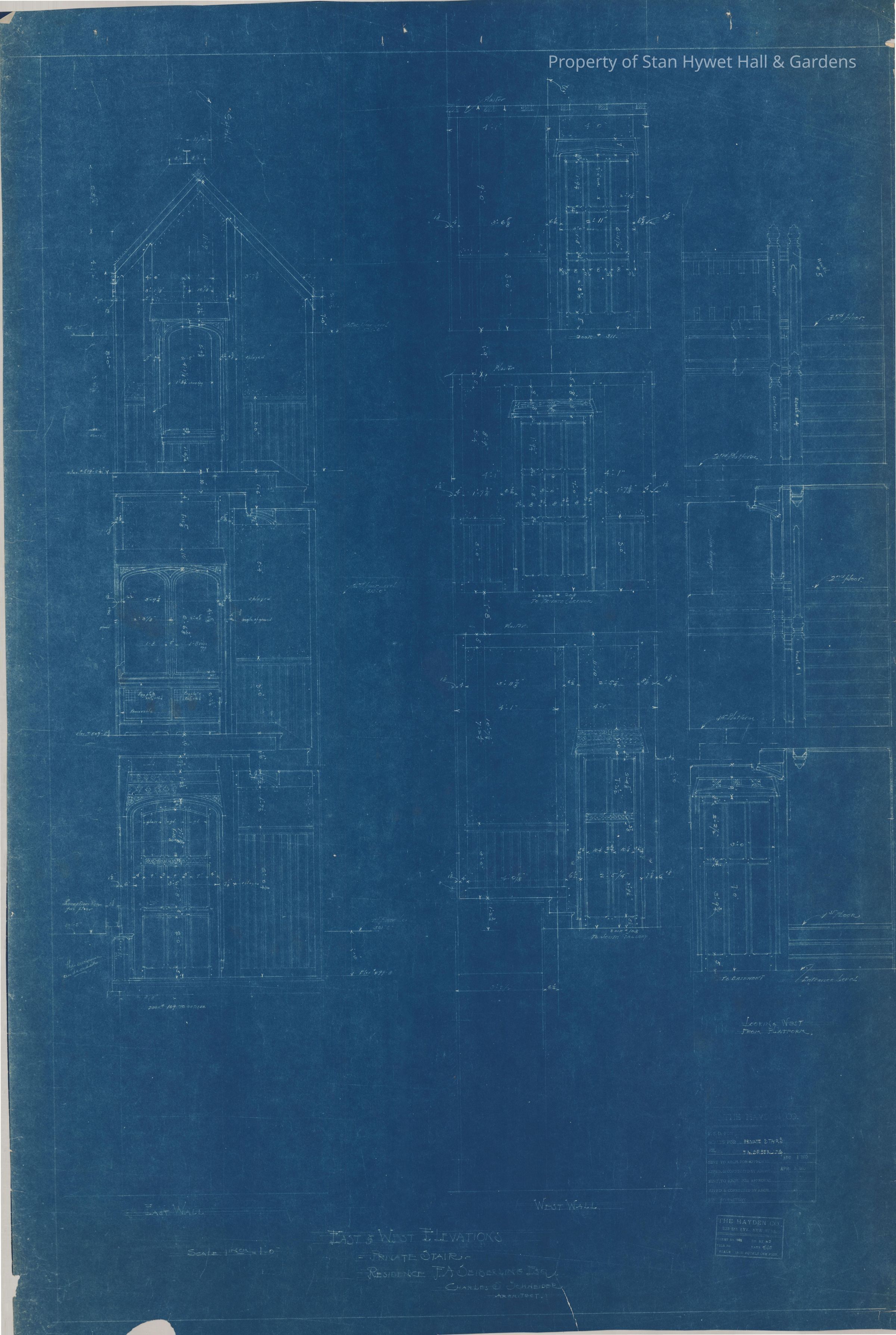 Historic Blueprint: Detailed drawing of the Private Stairs' east and west walls. Titled "East & West Elevations-Private Stairs".