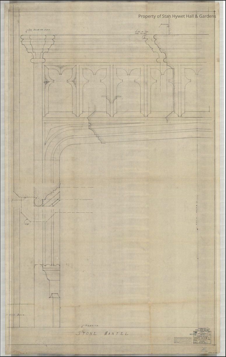 Historic drawing: Full sized detail of stonework fireplace and mantel in Irene's Bedroom. Titled "Interior Details: Irene's Room C".