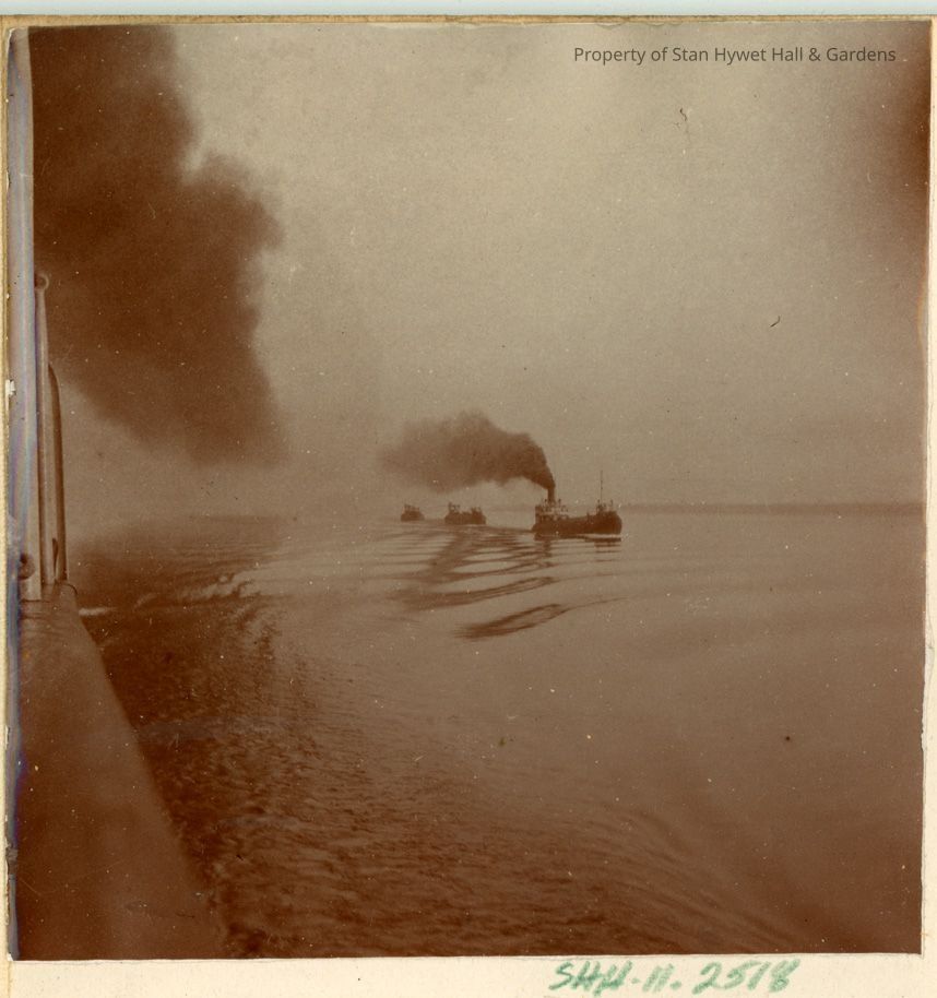 Black and white photograph taken from on board ship with railing and side of ship just visible on the left side. In a series of photos of the Seiberling family traveling on board ship to Cedar Lodge. Print shows three ore boats off the railing traveling on calm waters. The closest boat has a lot of smoke coming from smokestack. Some surface marks. Dark area upper right edge. Shoreline visible in background. From a series of photos of the Seiberling's summer home in and around Hessel, Michigan.Photograph Details
