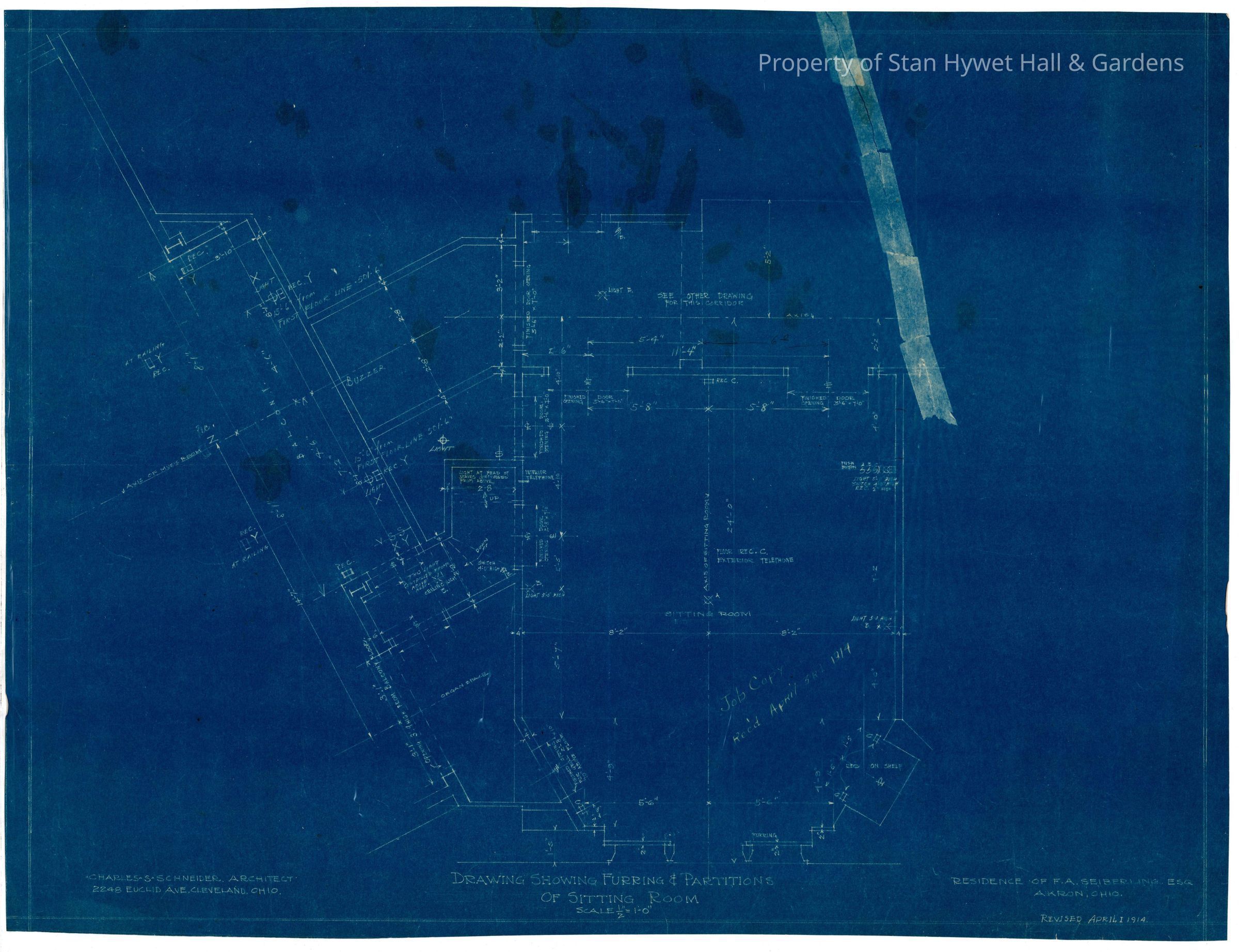 Historic blueprint: Plan for furring, partitions, and electrical for the Morning Room and the Musician's Balcony in Stan Hywet Hall. Titled "Drawing Showing Furring & Partition of Sitting Room".