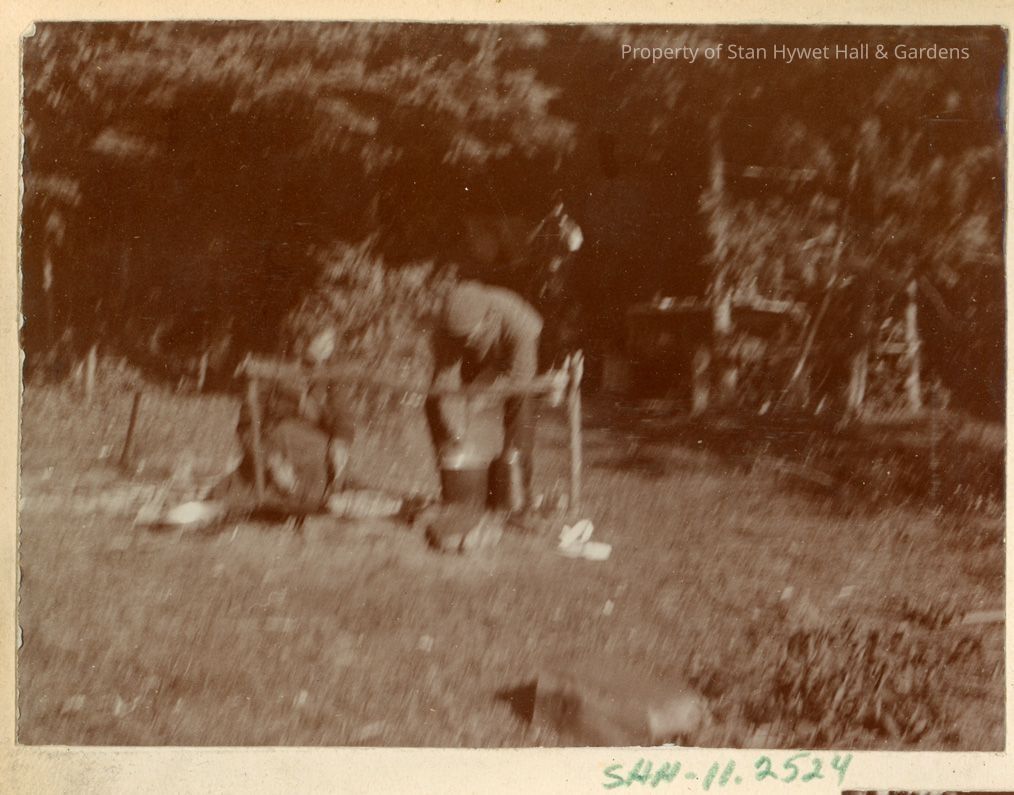 Black and white photographic print of two people working at cooking fire. Woman in a long dark skirt is squatting near a cook fire and looking at man bending over a pot hanging from a spit. Other pans and racks visible around fire. Dark woods in background. Rock and brush lower right edge of photo. Photo is blurry and has some negative spots. From a series of photos of the Seiberling's summer home in and around Hessel, Michigan.Photograph Details
