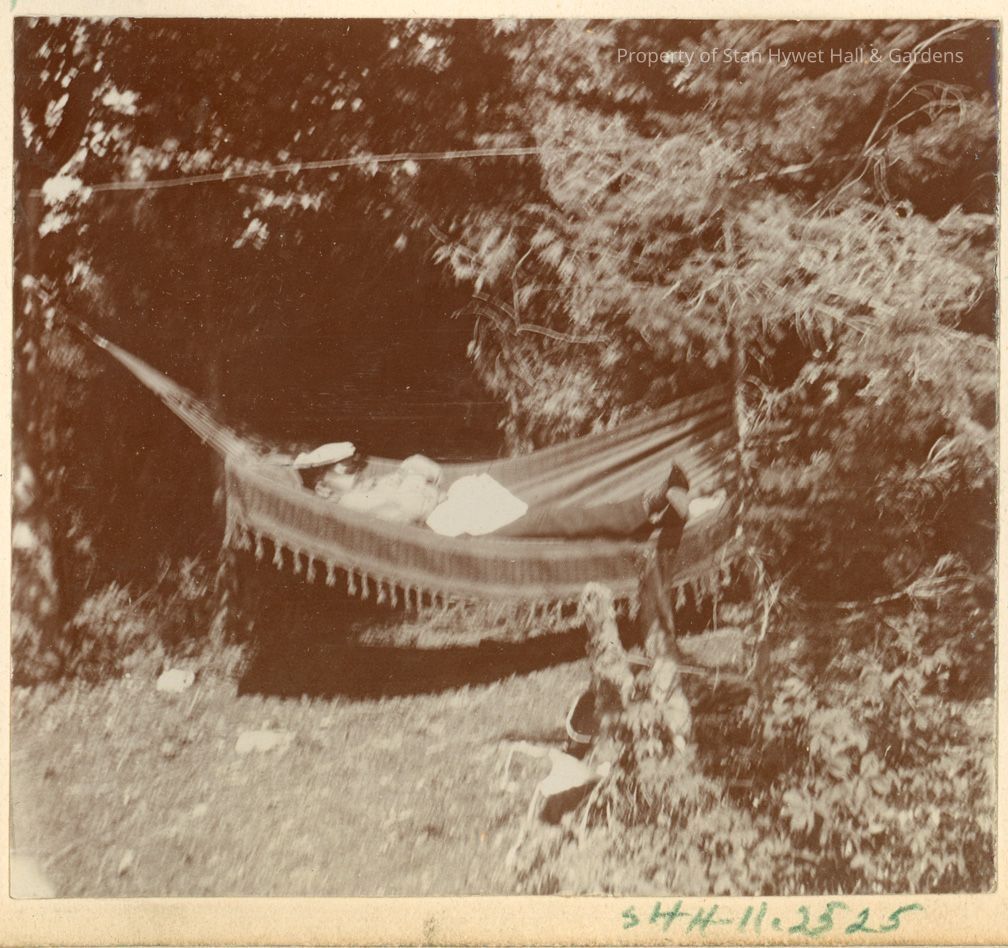 Black and white photographic print. F.A.Seiberling taking a nap in hammock. He has a white cap with a visor over his face, arms folded and possibly a newspaper or reading material abdomen, dark trousers, feet over edge of hammock. Strung with line over top of it. Very fancy fringe hanging down along the side. Lots of trees, bushes, etc. Light spot lower left corner. From a series of photos of the Seiberling's summer home in and around Hessel, Michigan.Photograph Details
