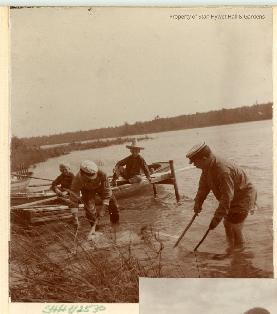 Black and white photographic print. F.A.Seiberling wearing what appears to be a long shirt, hanging down to mid-thigh, with no pants. He is holding two sticks attached to a net possibly catching bait for fishing. Another man with net doing same thing. Two young boys, likely Fred and Willard, sitting on a small dock watching. Rowboat on other side of dock. Lake in background. From a series of photos of the Seiberling's summer home in and around Hessel, Michigan.Photograph Details