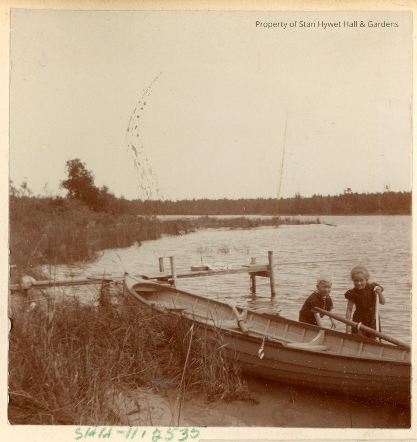 Black and white photographic print of two small blond children, Irene & Willard, in bathing suits playing in the water by a row boat. The bow of rowboat is pulled to little narrow rock. It is parallel to the shore. The children are at the lake side of the boat near the stern. There is a dock to the left. From a series of photos of the Seiberling's summer home in and around Hessel, Michigan.Photograph Details