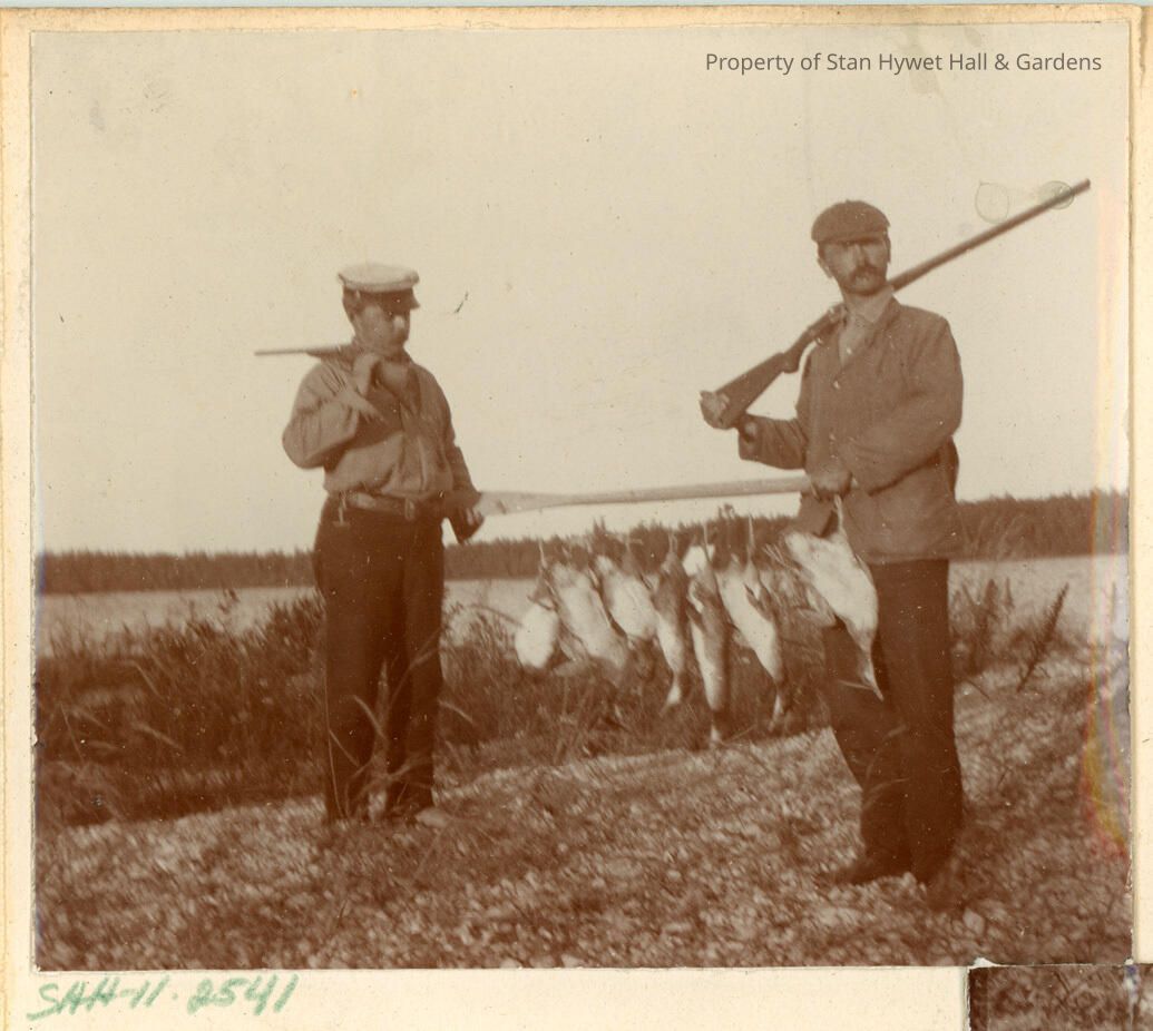 Black and white photographic print of F.A. Seiberling (left) and Will Chase (right) standing outdoors near a lake. Each man has a rifle slung over his shoulder, and they are holding a pole between them with several ducks hanging from it—presumably their catch from a hunting trip. F.A. is wearing dark pants, a light-colored shirt, and a captains cap. Will is dressed in dark pants and a jacket and a flat cap. Lake in background. The bottom left corner of the image includes the identifier "SHH-11.2541". From a series of photos of the Seiberling's summer home in and around Hessel, Michigan.Photograph Details