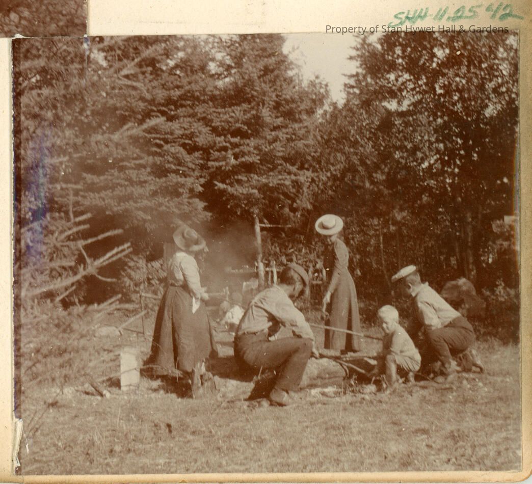 Black and white photographic print of the family cooking over a campfire. F.A. Seiberling is kneeling at right with Willard looking at the ground to his left. Will Chase is straddling a log doing something at the fire with Gertrude Seiberling (left) and Grace Chase (right) helping. In typical camping attire, long sleeve shirts, and hats. Trees in background. From a series of photos of the Seiberling's summer home in and around Hessel, Michigan.Photograph Details