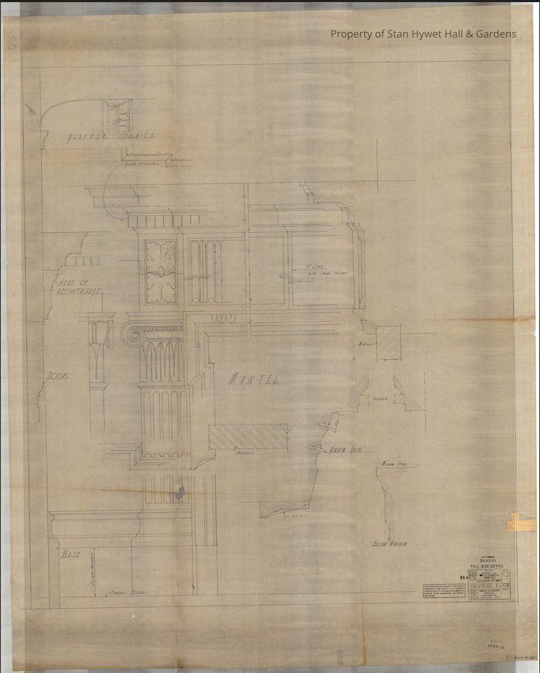 Historic drawing: Full size detail of fireplace and mantel in Virginia's Bedroom. Titled "Interior Details: Virginia's Room".