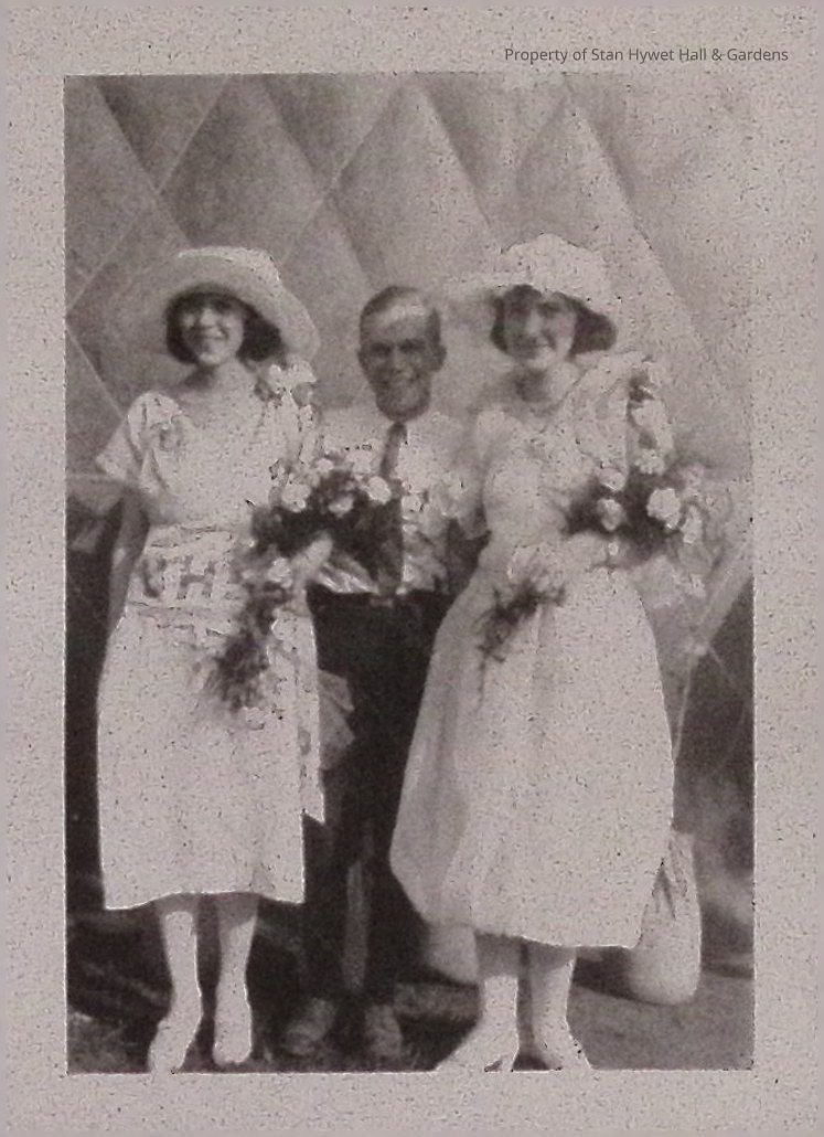Black and white photographic print of Willard Seiberling standing posed in front of air balloon with two unidentified females. Willard standing in middle wearing dark slacks, white dress shirt and tie. Both women wearing white short-sleeved dresses, white hose and shoes, and white hats. Both have short dark hair and are holding bouquets of flowers with proper left arms. Dirt and sandbags in foreground and portion of air balloon in background.Photograph Details