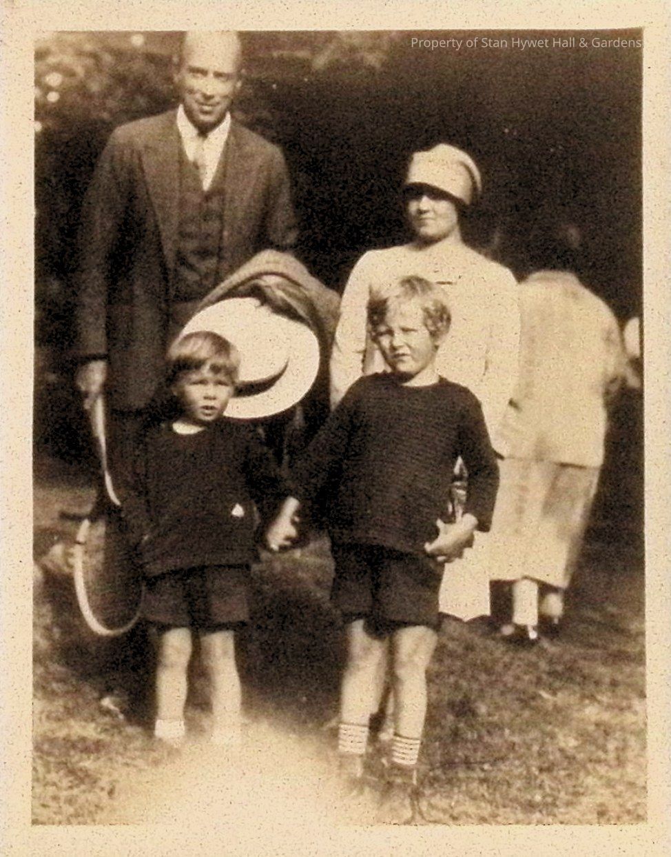 Black and white photo print/snapshot of Jack, Virginia, Ned and John Handy at Cedar Lodge, Michigan. Posed image taken outside with steps of a cabin in background on right of photo. Jack and Virginia posed standing behind two blonde boys who are holding hands. Jack, on left side of photo, dressed in dark suit, vest and tie, holding tennis racket in proper right hand, down at his side, and a folded coat and white hat in proper left hand. Virginia dressed in light colored dress and bonnet, holding dark purse in proper left hand which is at her side. Smaller child (Ned) dressed in dark horizontally striped shirt and dark shorts. Older and taller boy (Jack Jr.) stands to Ned's proper left, dressed in similar outfit; Gertrude Seiberling, is standing behind foursome with her back to the camera near far right side of photo. Trees and shrubs in background; grass lawn in foreground.Photograph Details