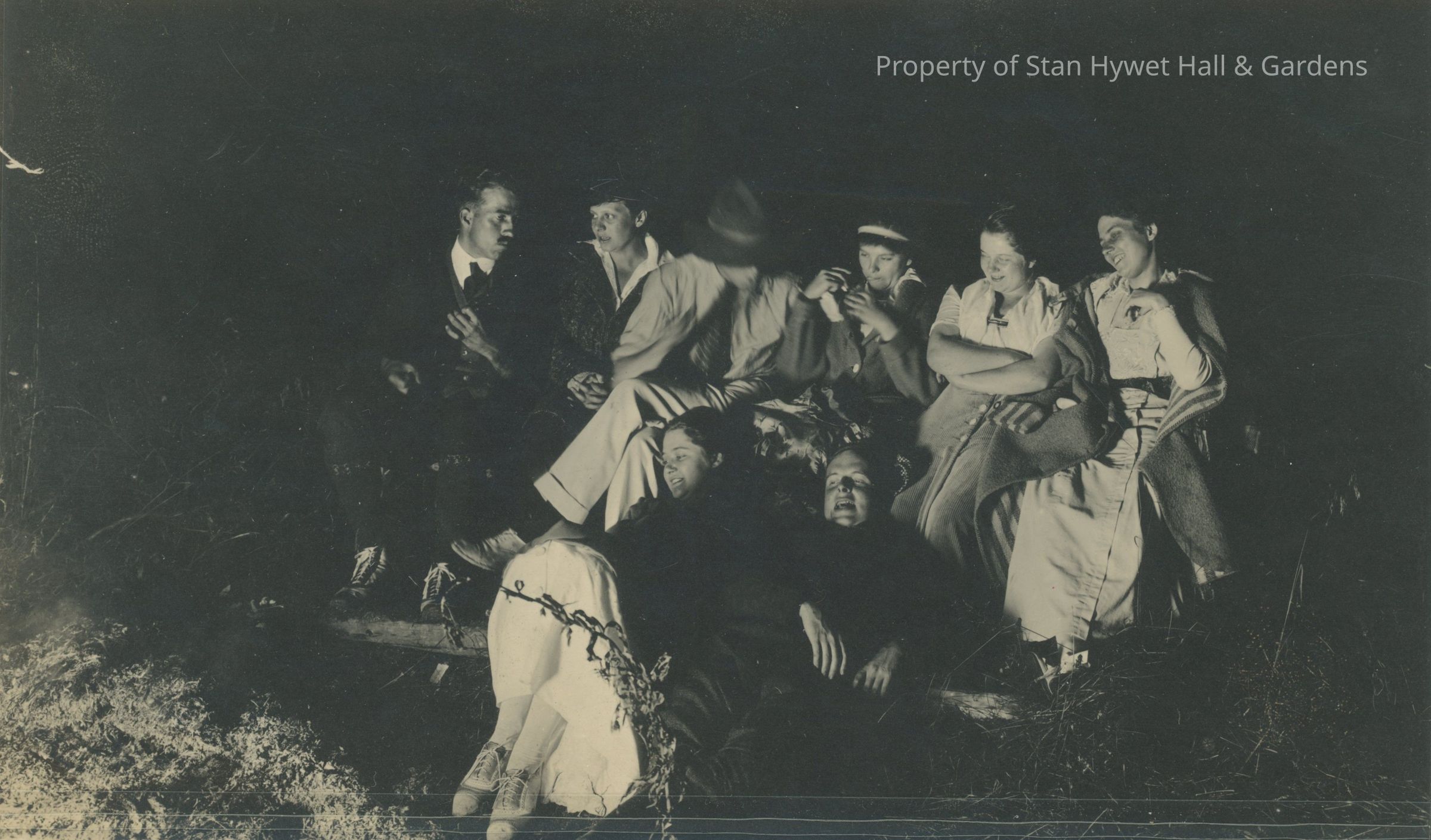 Similar to SHH 93.375.1 except all are seated and only eight are in picture. Virginia is seated with arms crossed second to right. Six are seated on wood bench (two men, four women) and two are seated on log footrest (one man, one woman). View is taken slightly to proper left of group. Campfire is out of sight but near lower left of photo.Photograph Details