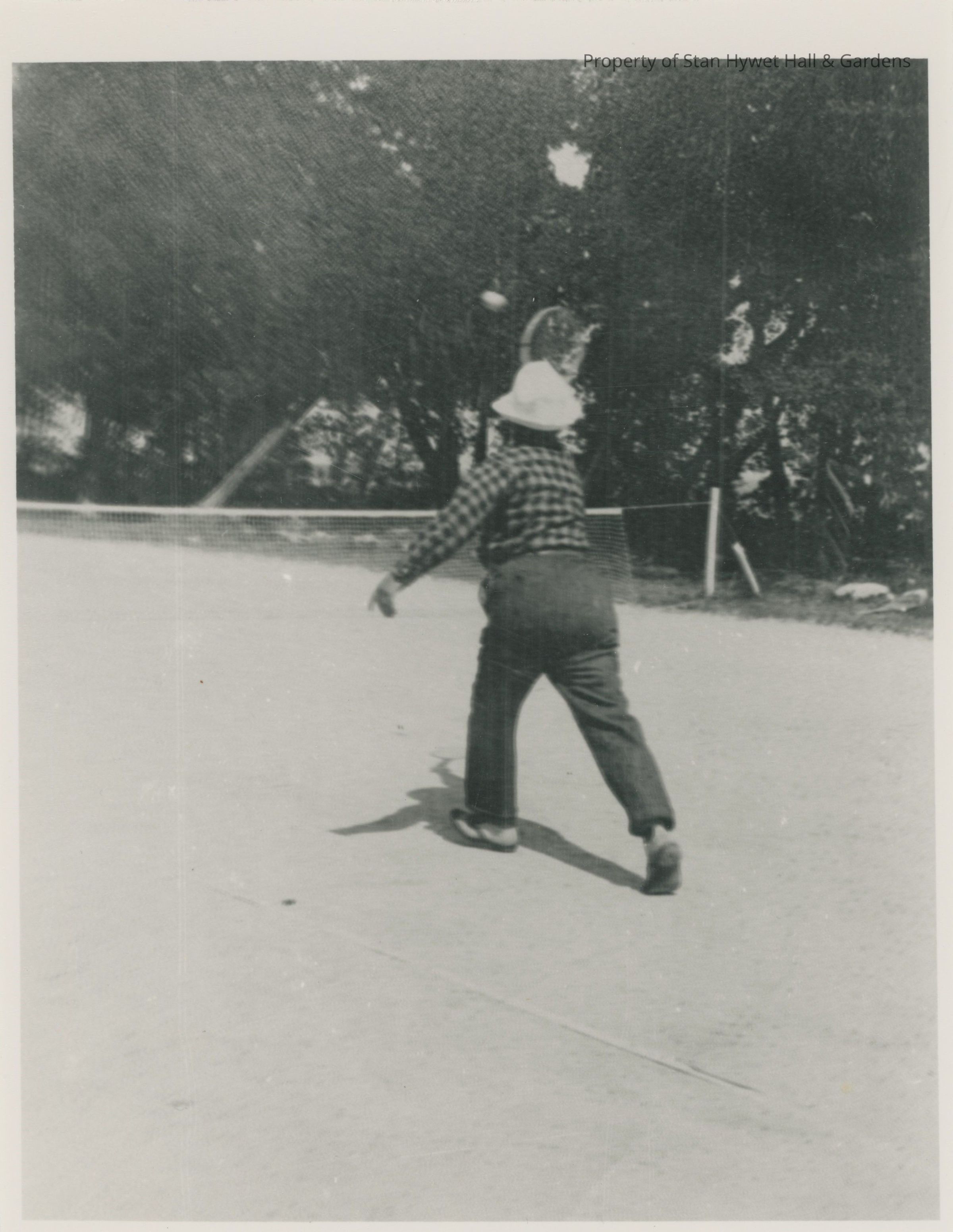 Black and white photograph of F.A. Seiberling playing tennis at Cedar Lodge. He is wearing dark, casual slacks with a checked, long-sleeve shirt and a light colored bucket hat. He is stepping into a swing with the tennis racket in front of his head in his right hand and holding his left arm out to the side. This is a modern copy of an original.Photograph Details