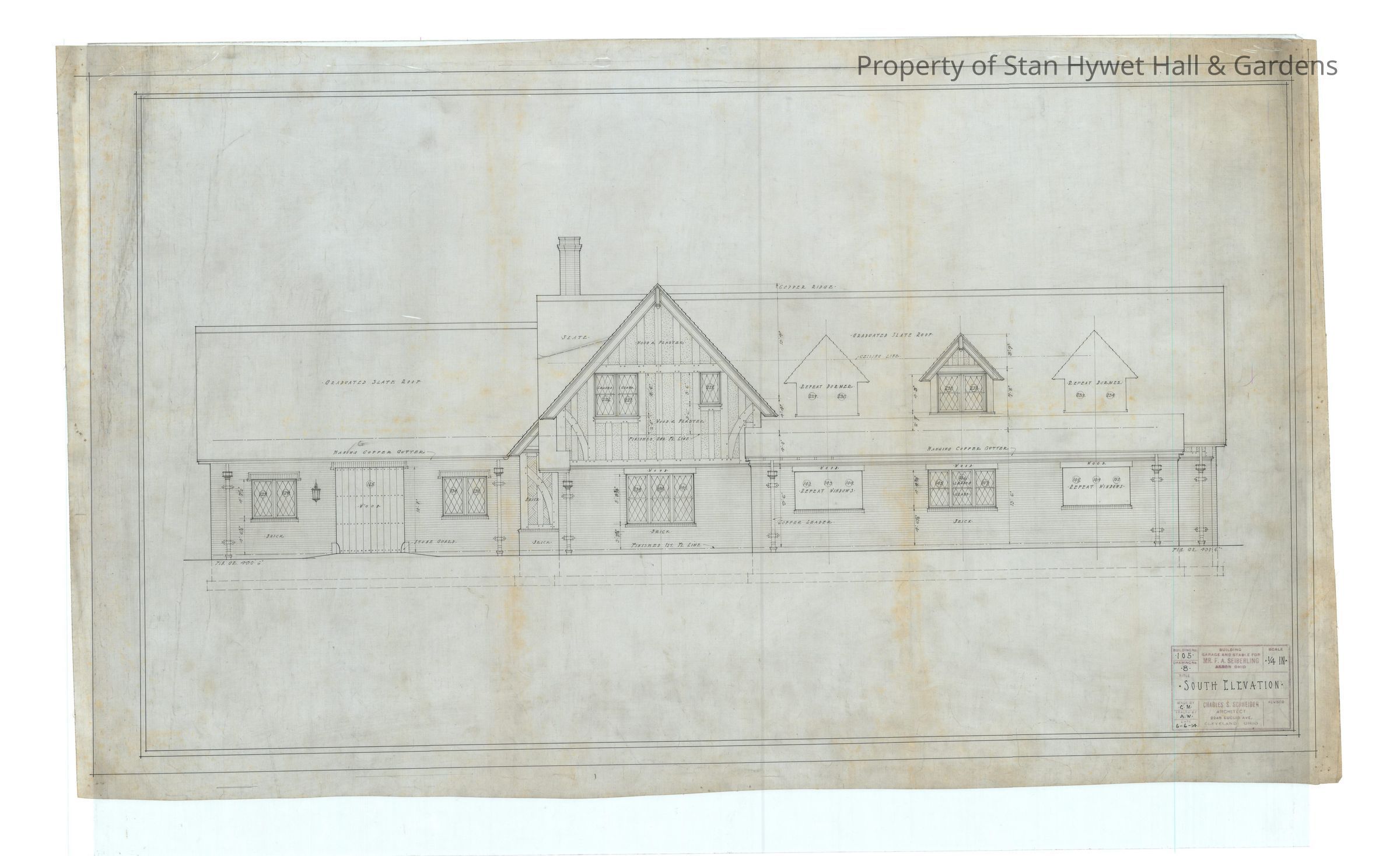 Historic blueprint: South elevation of the Carriage House on the Stan Hywet estate. Titled "South Elevation".