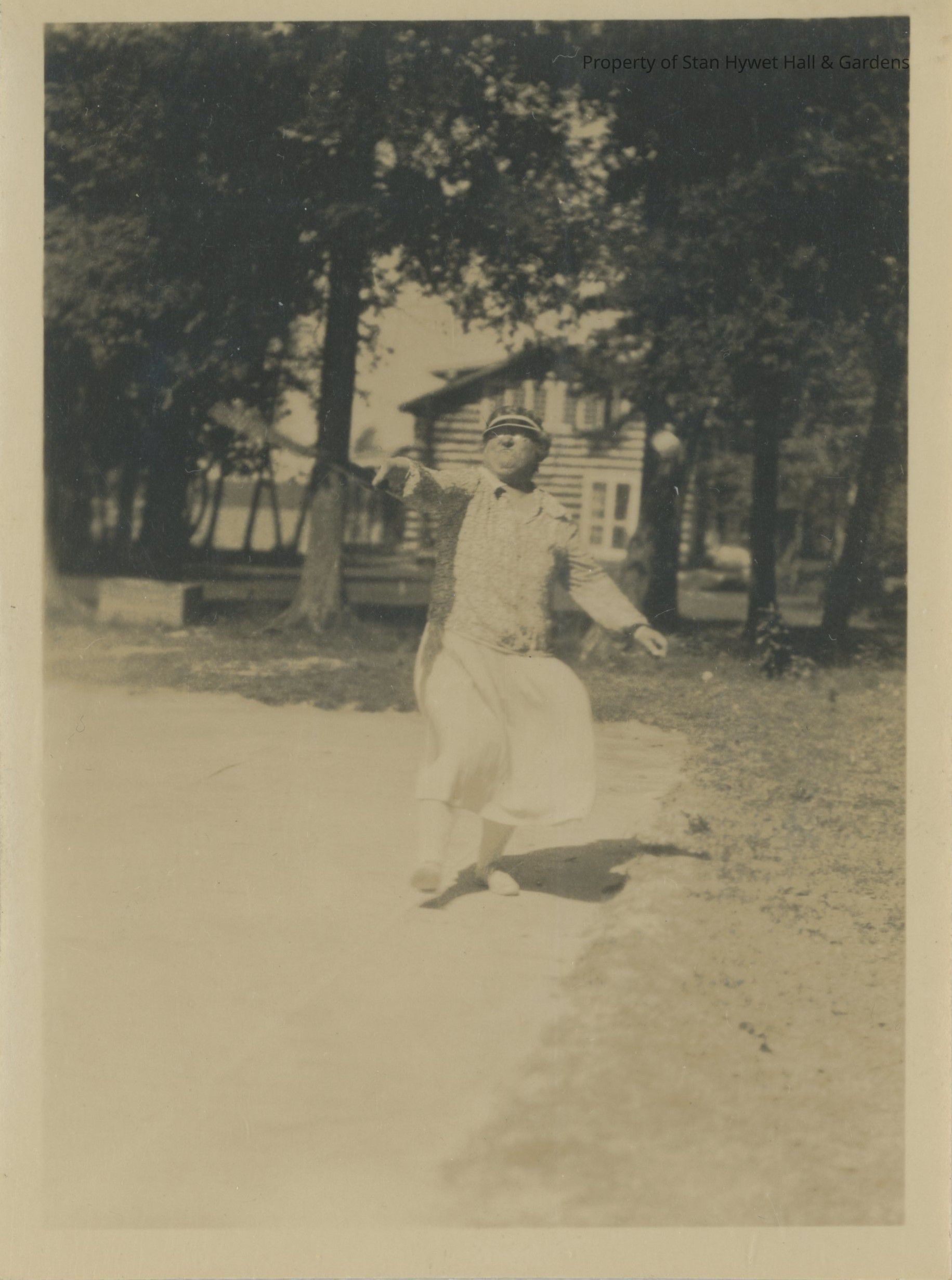 Black and white photo print/snapshot of Gertrude F. P. Seiberling playing tennis at Cedar Lodge, Michigan, 1 of 3. All action photos, Gertrude dressed in light colored dress/skirt, floral jacket/blouse, white hose and shoes and dark visor cap. All slightly hazy. Located near far right corner of court. Proper right arm is extended in front of her holding tennis racket; proper left arm is extended to her left side. Proper right foot is slightly off ground; ball apparently to her left. Log cabin in background directly behind her. Trees and branches in background; edge of court is dirt and grass.Photograph Details
