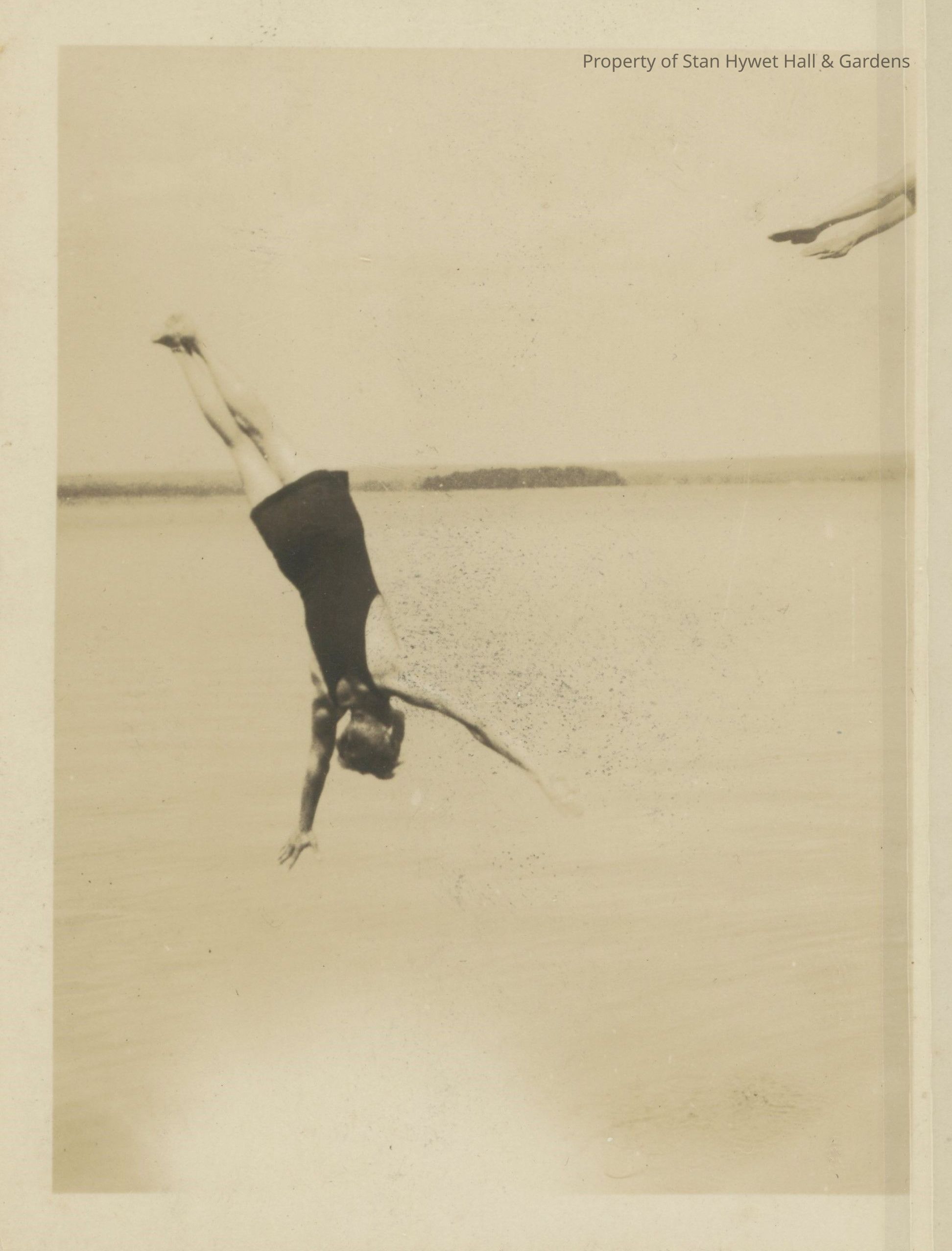 Black and white photo print/snapshot of young man diving into lake at Cedar Lodge, Michigan. Young man on left side of photo upside down with both arms extended vertically above head; dressed in dark sleeveless swimsuit. Two extended arms of unidentified individual on upper right corner of photo. Sky and wooded island/land in background; waste in foreground. Overexposed spot on lower center edge of photo.Photograph Details