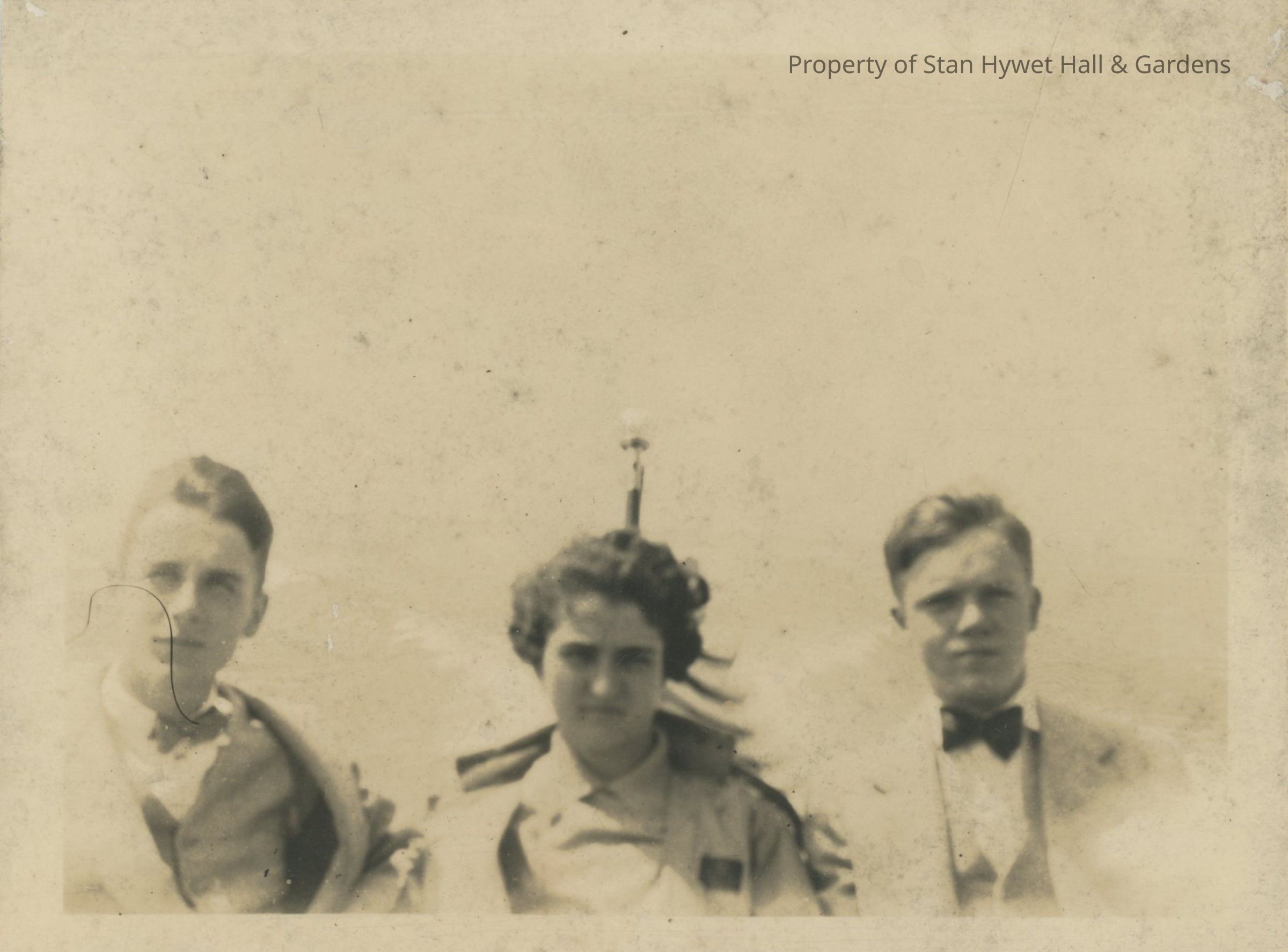 Black and white photo print/snapshot of three young adults sitting in back seat of motor boat on lake near Cedar Lodge, Michigan. Franklin Seiberling, Jr. seated to far right of photo dressed in light colored vest and coat, white shirt and dark bowtie. Unidentified woman with short, dark hair seated in middle, dressed in light colored blouse. Unidentified man on far left dressed in light colored vest and coat, white shirt and dark bowtie. Man has proper left arm around woman at center. Flag pole evident directly behind woman. Very hazy image.Photograph Details