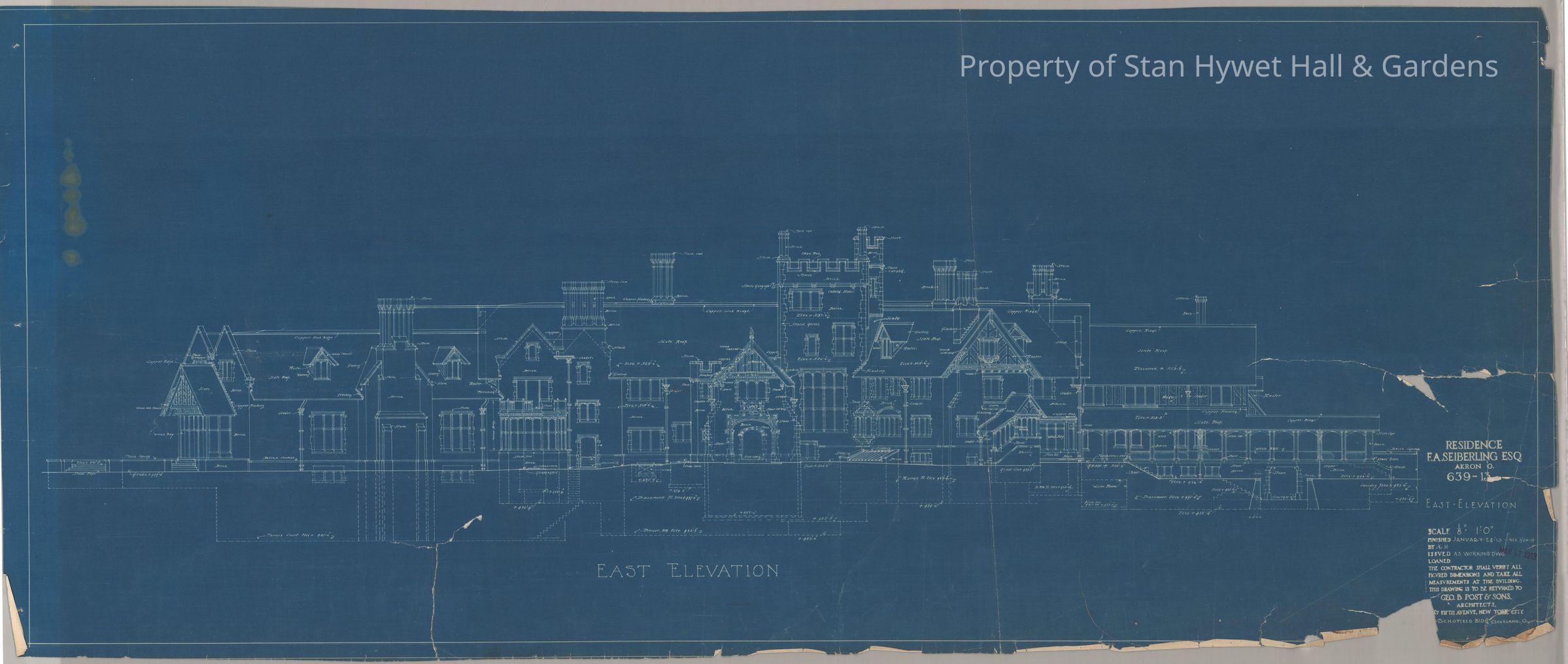 Historic blueprint: Detailed drawing of the entire east elevation of the Manor House. Titled "East Elevation".