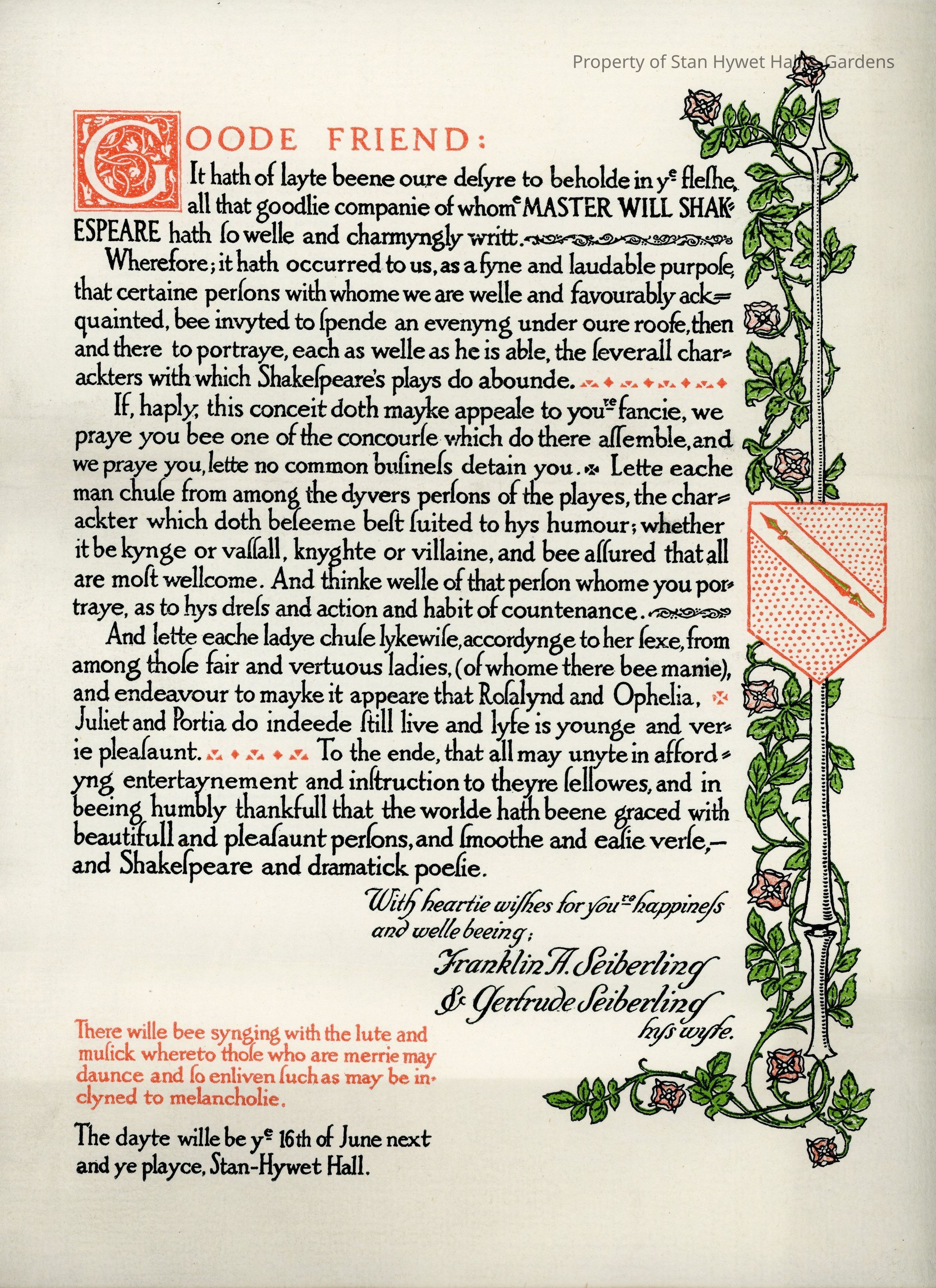 Invitation on heavy parchment with uncut edges, written in old English style and spellings. The right side and bottom corner are adorned with red Tudor roses on a green leafy vine with a red shield in the center.Creator