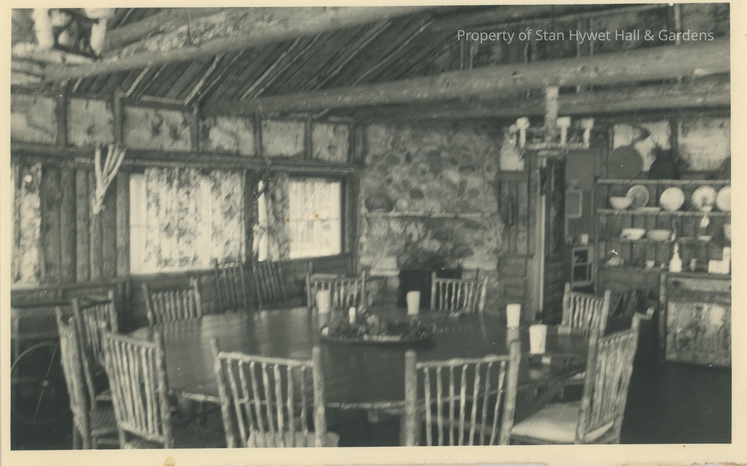Black and white photographic print of the interior of the Seiberlings Main Dining Room above one of the boathouses at Cedar Lodge. Stone wall at back surrounded and topped by raw timbers and natural bark decorations. A hutch at far right in the background, equally rustic in design, with dishware stored in and on it. Large circular table at center of photo with four place settings of napkins and white glasses, a low decoration in center of table. Ten side chairs at table and two visible at back wall under windows. Modern copyPhotograph Details