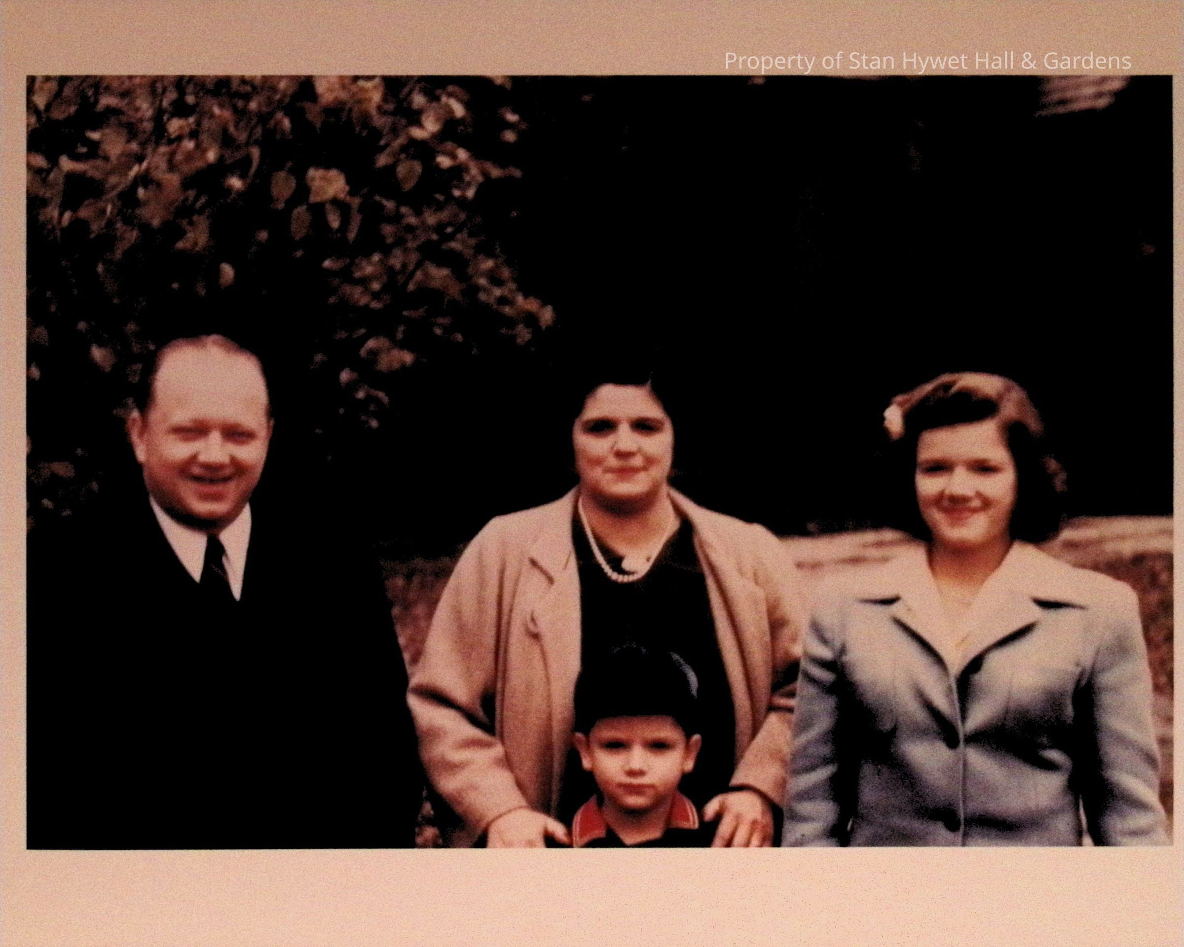 Color photographic print mounted on brown mat board. The Penfield Seiberling family standing on the circle drive in front of Stan Hywet Hall. From left to right: Penfield Seiberling, Harriet Manton Seiberling, Mary Margaret Seiberling Chapman with Jim Seiberling in front. At left tall bush behind Penfield, little sunlight across building façade which is visible only to the south side of the front entrance porch. Autumn with leaves on the drive and lawn. Penfield attired in a dark coat, white shirt and striped tie; Harriet in beige coat, olive green dress, pearls and pin. Mary in light blue suit jacket with white blouse and flower or clip in hair; and Jim with royal blue cap on, dark jacket and red striped shirt collar.Photograph Details