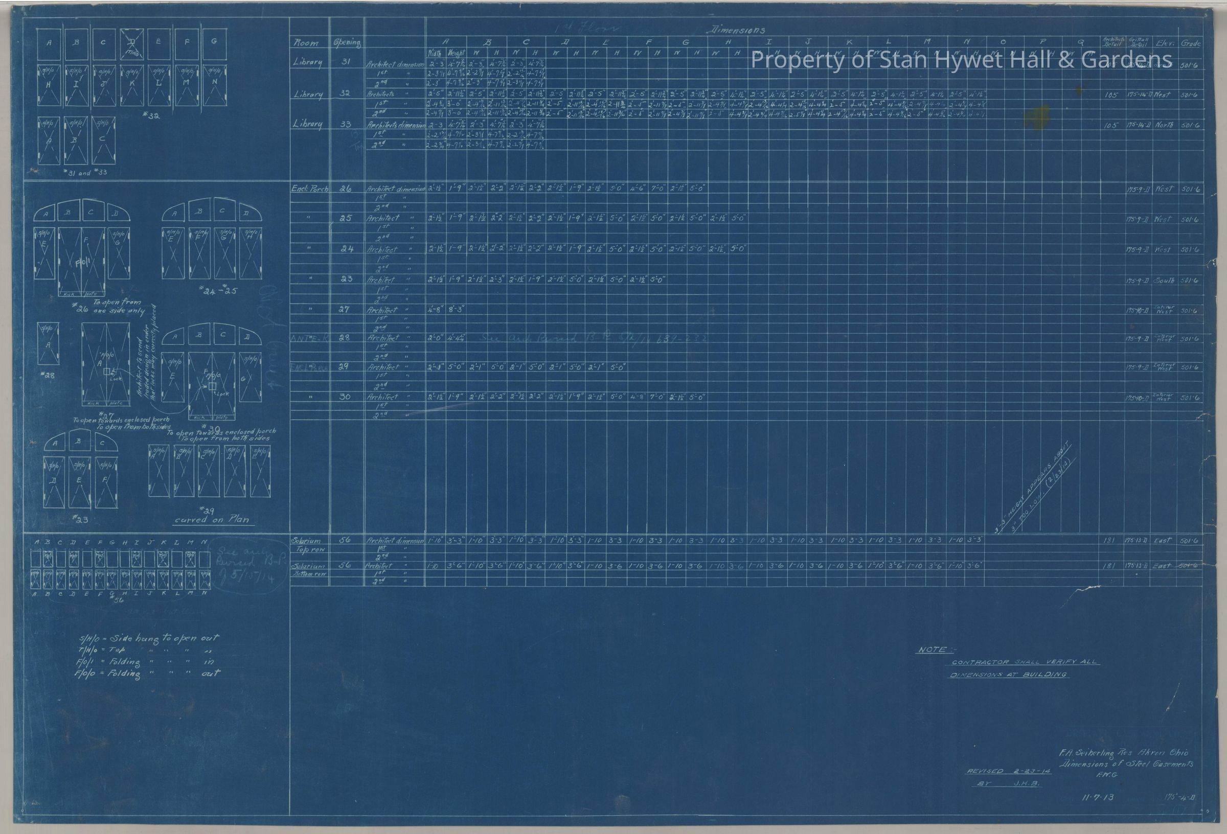 Historic Blueprint: Table detailing dimensions of steel casements of first floor south wing windows #23-33 & 56. Titled "Dimensions of Steel Casements".
