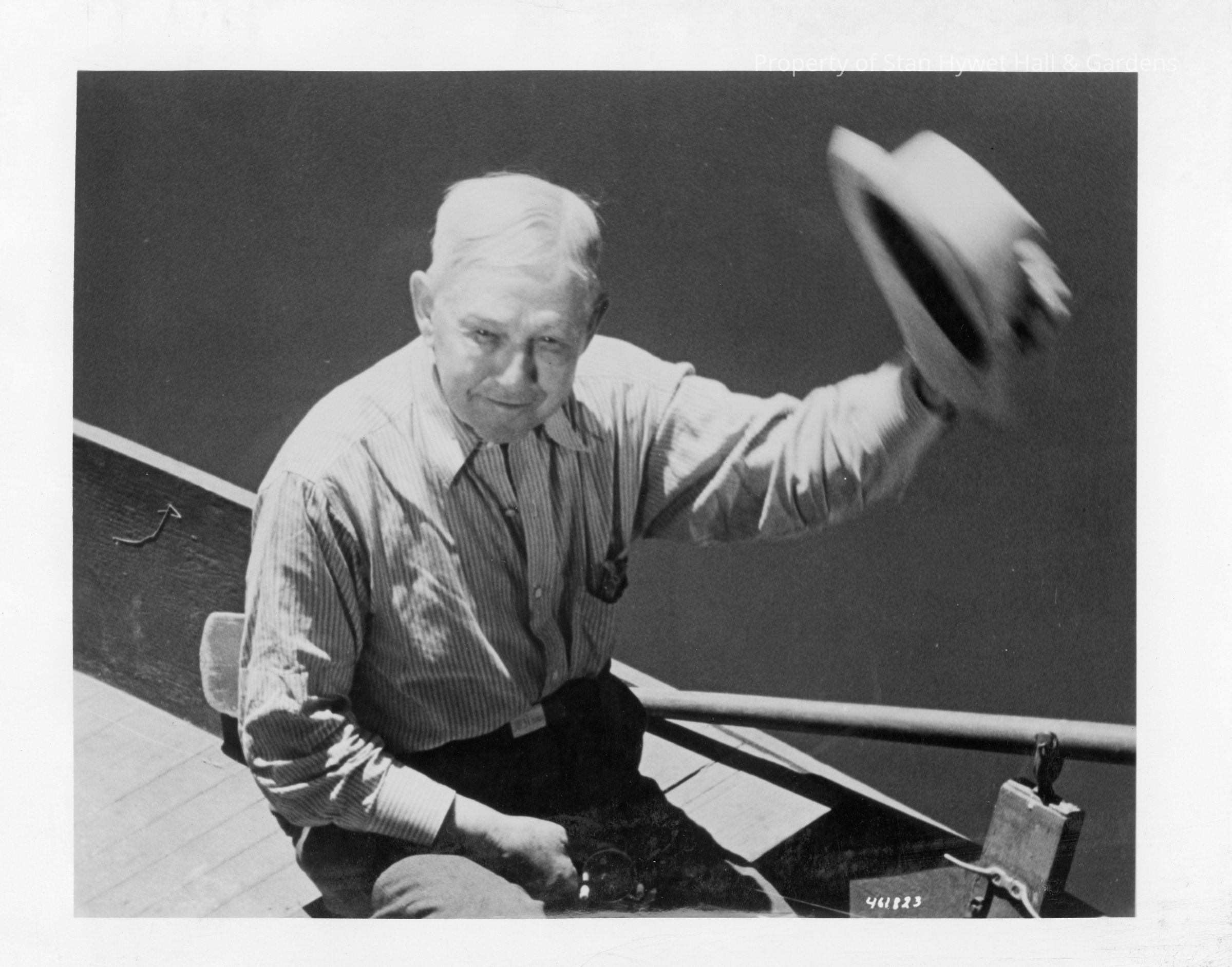 Black and white photographic print of Charles Willard "C.W." Seiberling sitting in row boat. Closeup view of C.W. Body facing to right of camera and head turned slightly directly toward camera. Proper left arm raised and outstretched with hat in proper left hand. Proper right hand in lap holding fishing reel and rod. Dressed in light-colored striped shirt and darker pants.Photograph Details