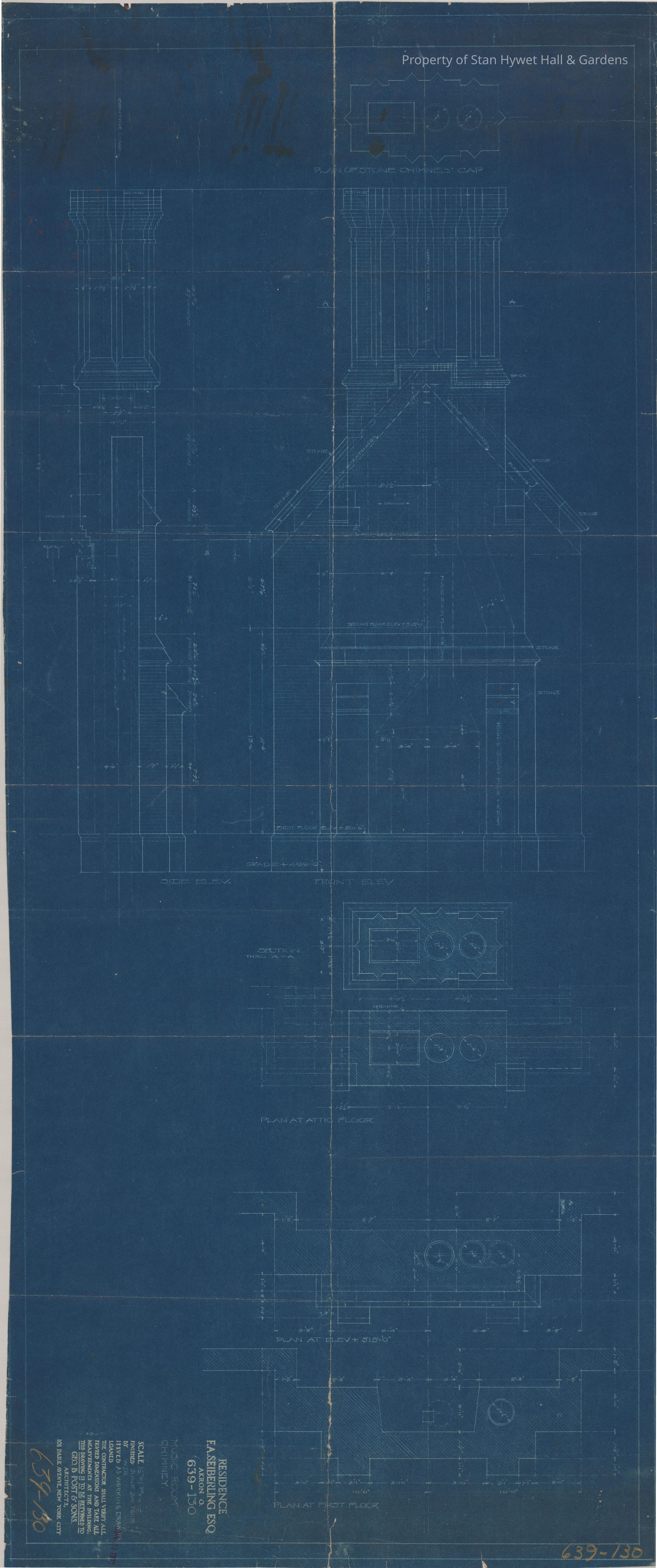 Historic blueprint: Detailed drawing of elevations of the Music Room chimney and plans of the chimney from different floors of the house. Titled "Music Room Chimney".
