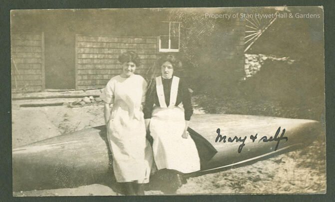 Black and white photo (matte surface, borderless). View of a 2 young woman sitting on the bottom of an over turned canoe, facing the camera smiling. Emily Sheppard is on the left wearing a white dress and Mary Byrne is on the right wearing a dark domestic staff dress with white apron. Both have their hair up. There is a building with window, door and porch in the background. Hand written on the canoe "Mary & self"Photograph Details