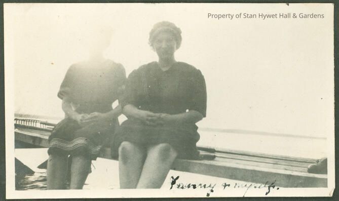 Black and white photo (matte surface, narrow border). View of a 2 young woman sitting on a dock with legs dangling. Emily Sheppard is on the left and Fanny is on the right. They are both in dark swim dresses with caps. Hand written at the bottom "Fanny and myself". Emily's entire head is not visible due to the sun behind her.Photograph Details