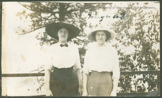 Black and white photo (matte surface, borderless). View of a 2 young woman standing facing the camera from thighs up. Emily Sheppard is on the right and Mary Byrne is on the left. They are both in dark skirts, white elbow sleeve blouses and large brimmed hats. Foliage and lake water is visible in the background. Hand written at the top "Mary & self".Photograph Details