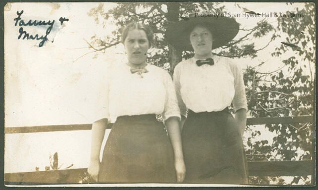 Black and white photo (matte surface, borderless). View of a 2 young woman standing facing the camera from thighs up. Fanny is on the left and Mary Byrne is on the right. They are both in dark skirts and white elbow sleeved blouses. Mary is wearing a large brimmed hat. Foliage and lake water is visible in the background. Hand written at the top left "Fanny & Mary".Photograph Details