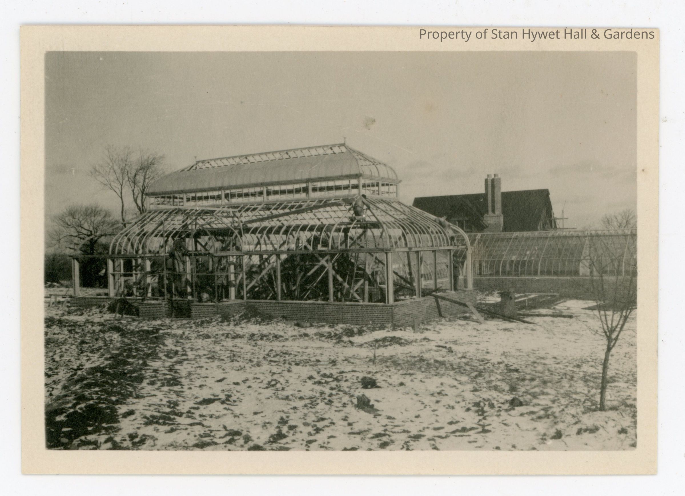 Black and white photograph of the conservatory under construction. The framing for the upper section and roof are in place with main supports on the brick foundation. No glass has been installed yet. The roof of the Gardener's Cottage can be seen over the greenhouse behind and to the right of the conservatory. A dusting of snow covers the ground.