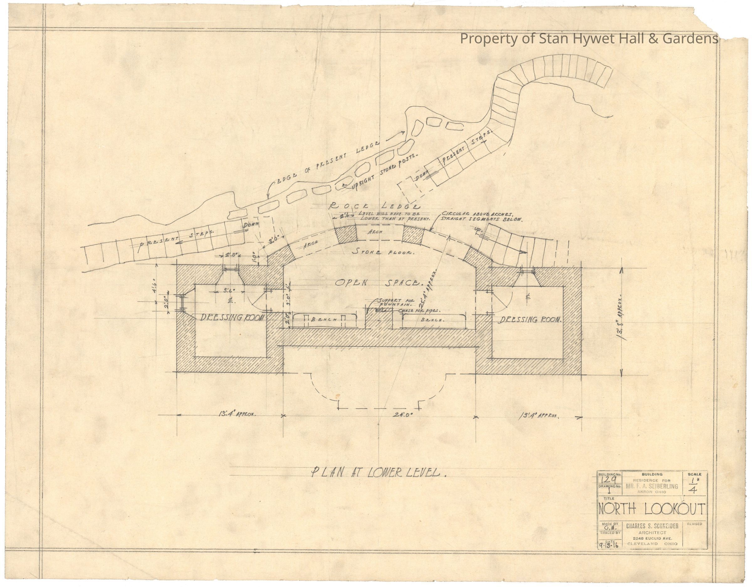 Historic drawing: Plan of lower level of Tea House (lagoon outlook). Titled "North Lookout".