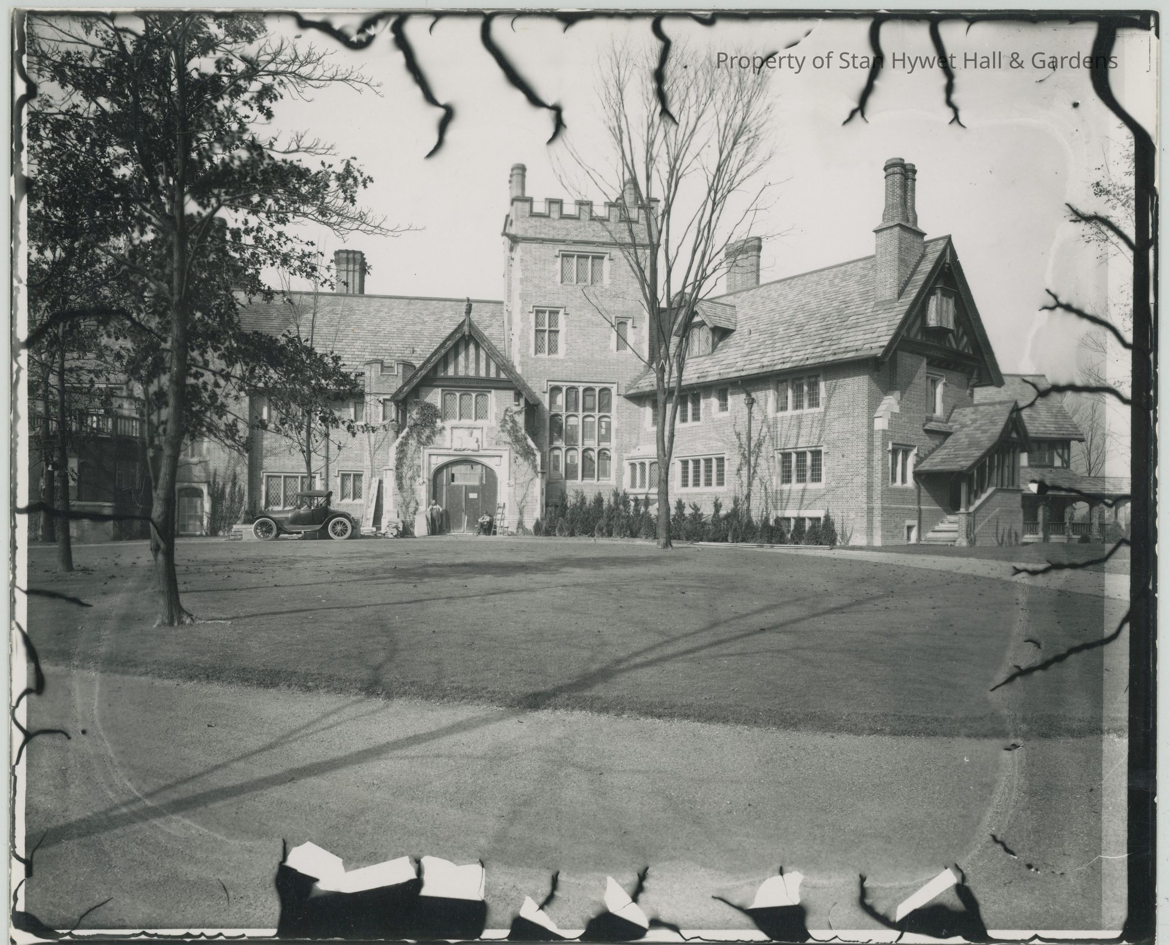 Black and white photograph of the front elevation of the Manor House from the entrance to F. A.'s office to the Solarium. A ladder leans against the main entrance which appears to be screened in. A workman is sitting on the step at the right of the doorway and another is standing leaning against the left side of the doorway. The tower stained glass windows have not yet been installed, nor has the family entrance door. A car is parked in front of the Reception Room windows. The photo shows evidence of damage to the glass plate negative. Appears to be an original print.Photograph Details