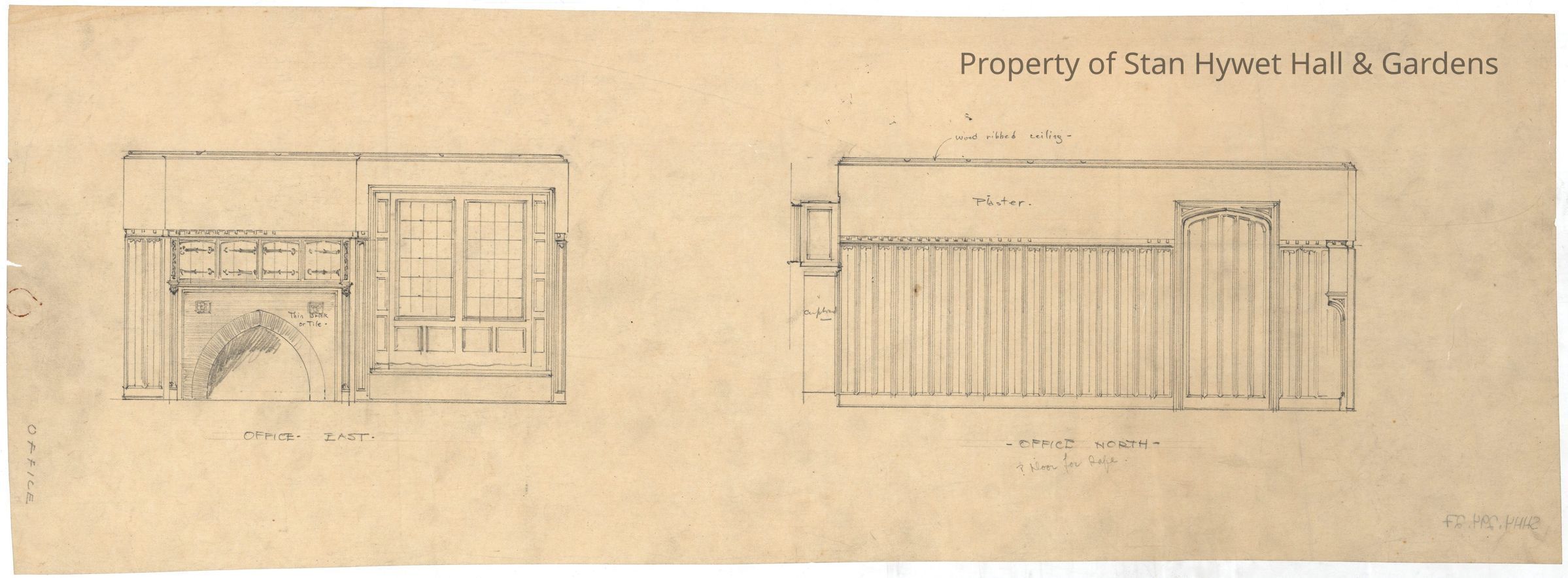 Historic drawing: Detailed drawing of FAS Office's east and north walls, including a concept drawing of the fireplace, which was not used in the final design.Collection