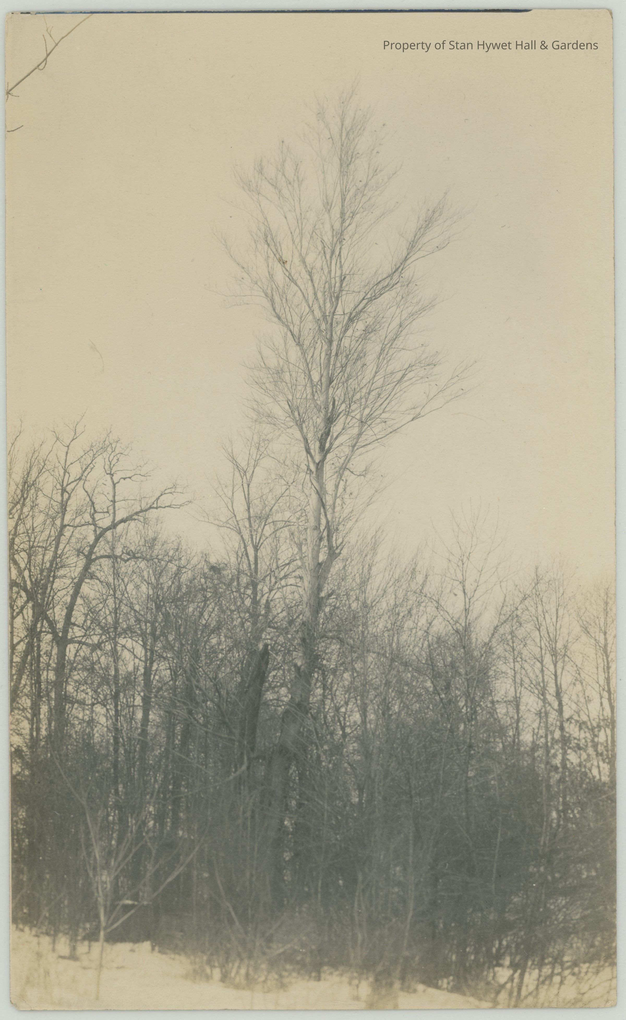 Black and white photo of farm before construction of SHH. A tall tree stands in the center of the photo and stretches to the top. Surrounding trees only from the middle of the photo on the left and about a third of the right. Snow covers the ground around the trees.Photograph Details