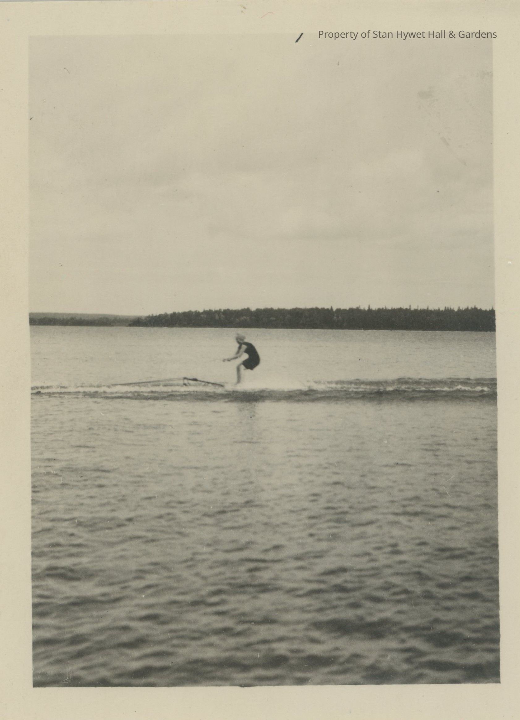 Black and white stereograph of a person wearing a bathing cap on an early wakeboard being pulled by a boat.Photograph Details