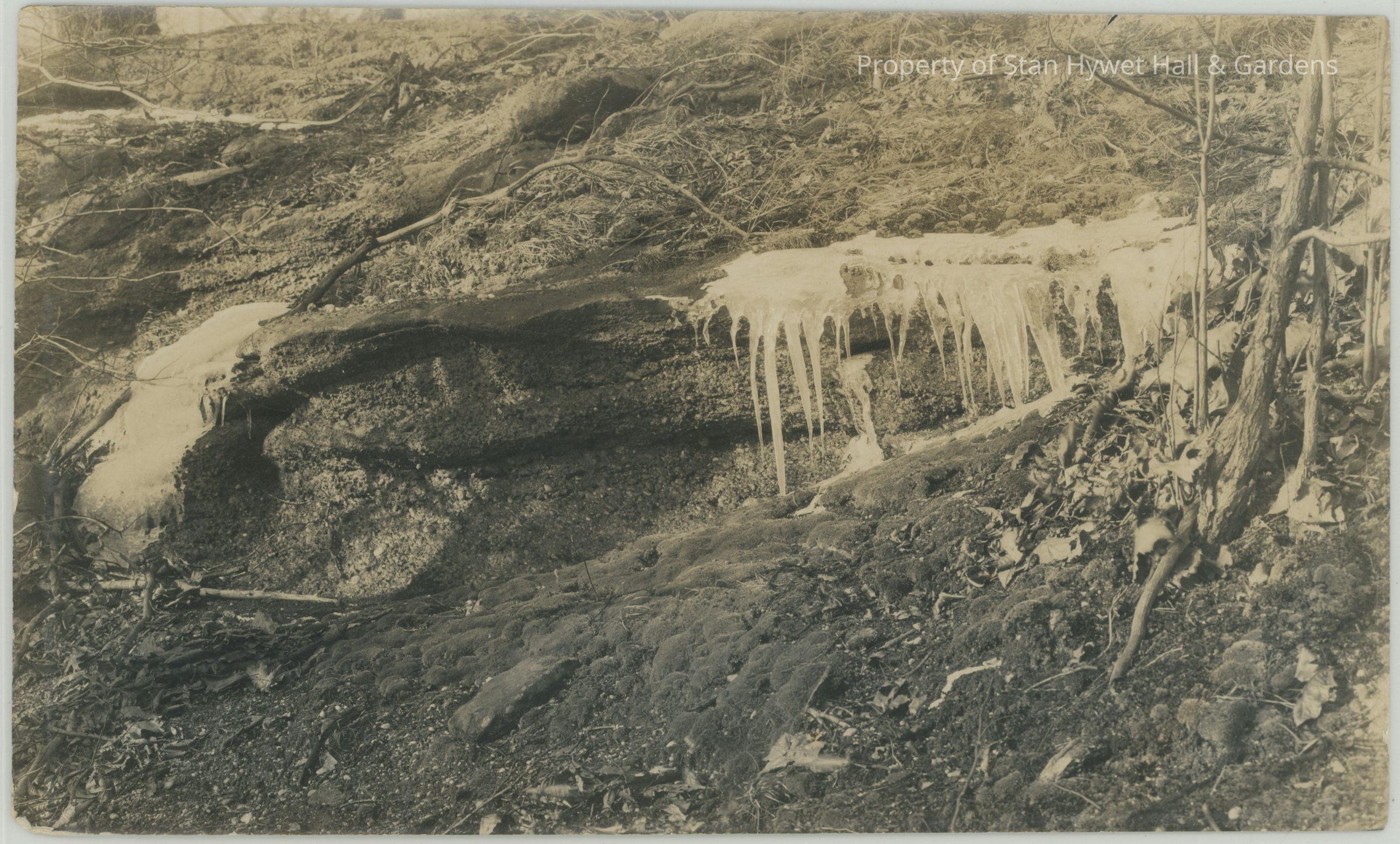 Black and white photograph of a rocky hillside with icicles forming on the edges of the rocks. On the left side is a small frozen waterfall although there is no apparent water. There are a few small tree trunks on the right side of the photo.Photograph Details