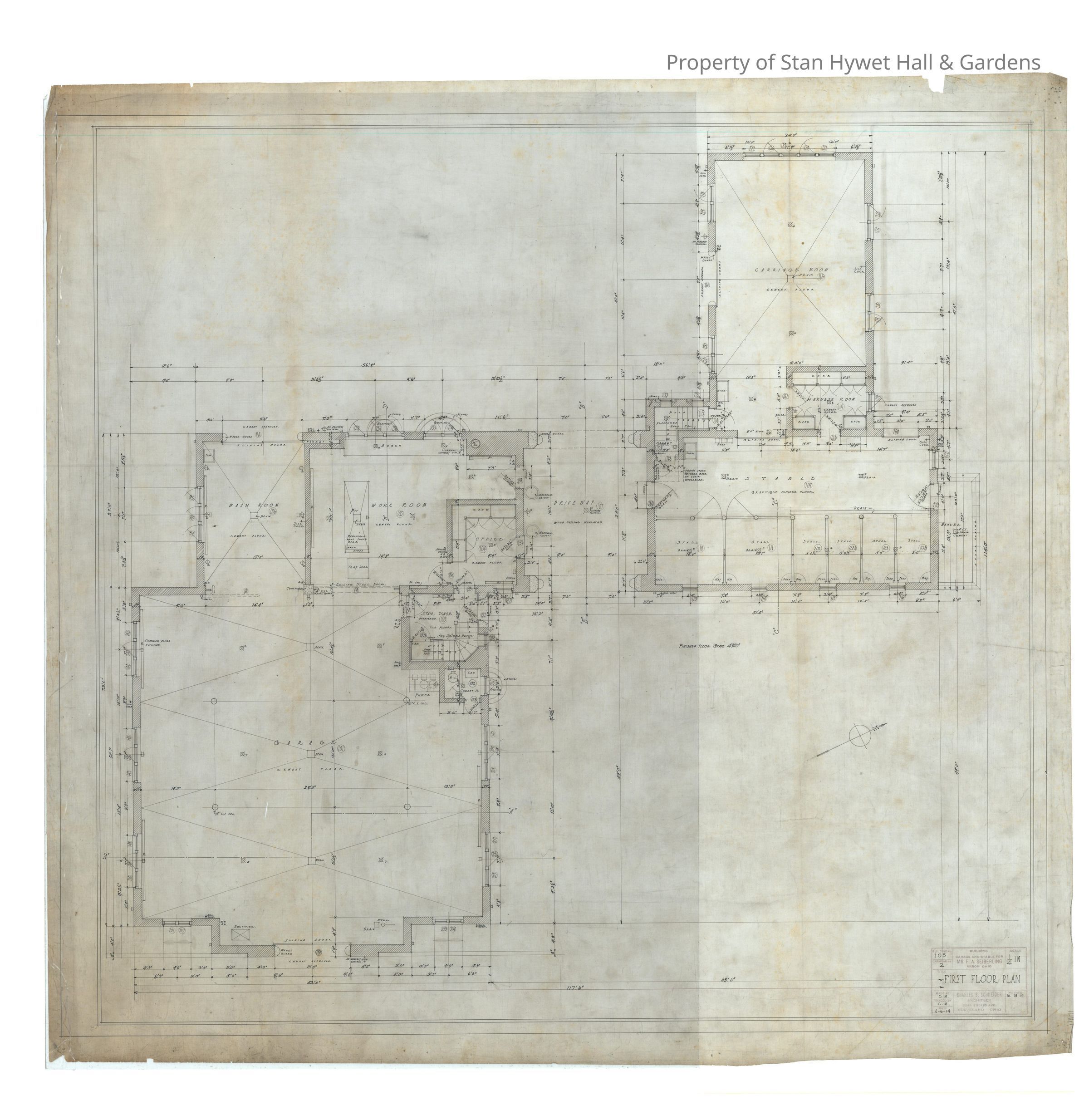 Historic drawing: First floor plan of the Carriage House on Stan Hywet estate. Titled "First Floor Plan".