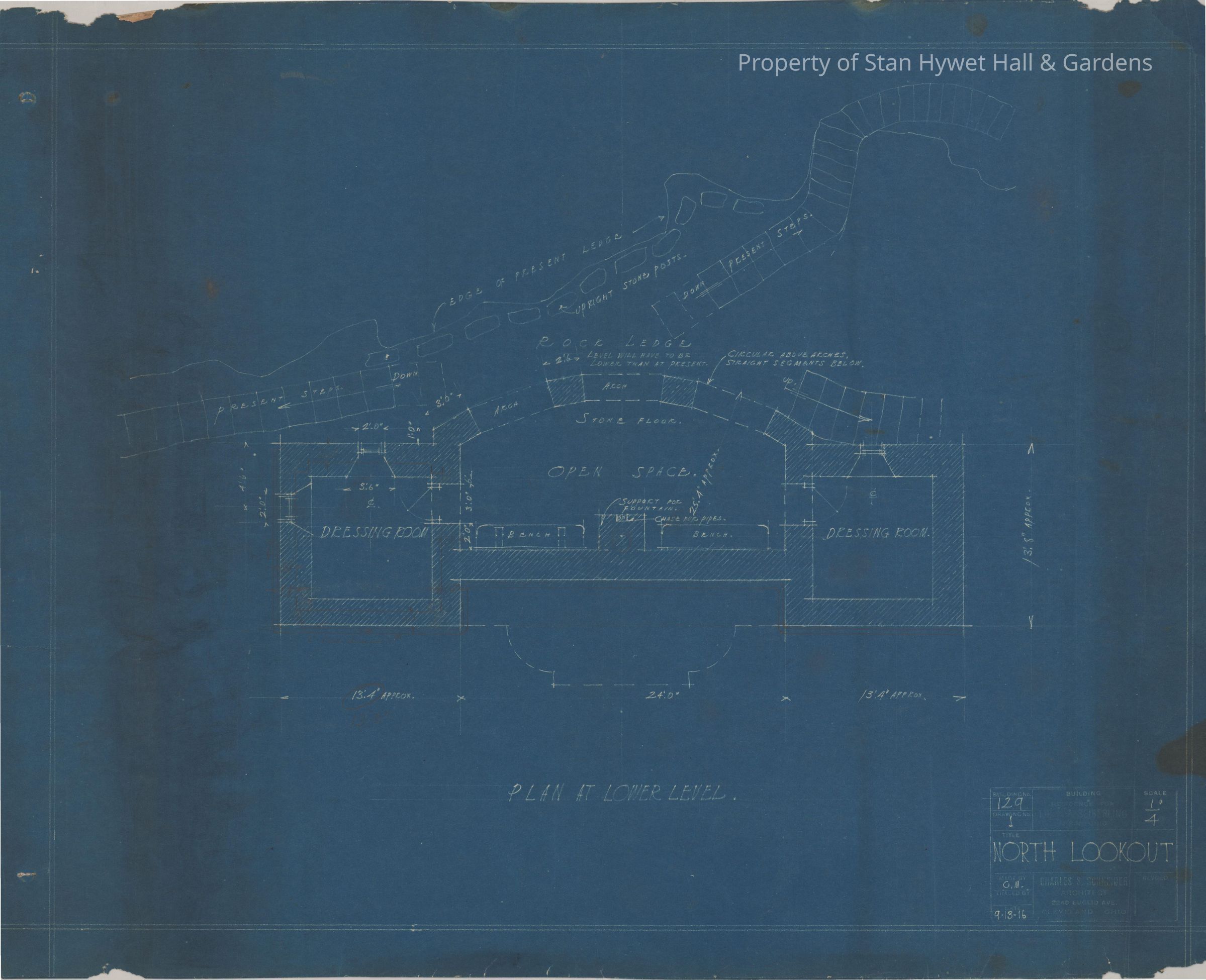 Historic Blueprint: Plan of the lower level of the Tea Houses. Titled "Plan at Lower Level; North Outlook".