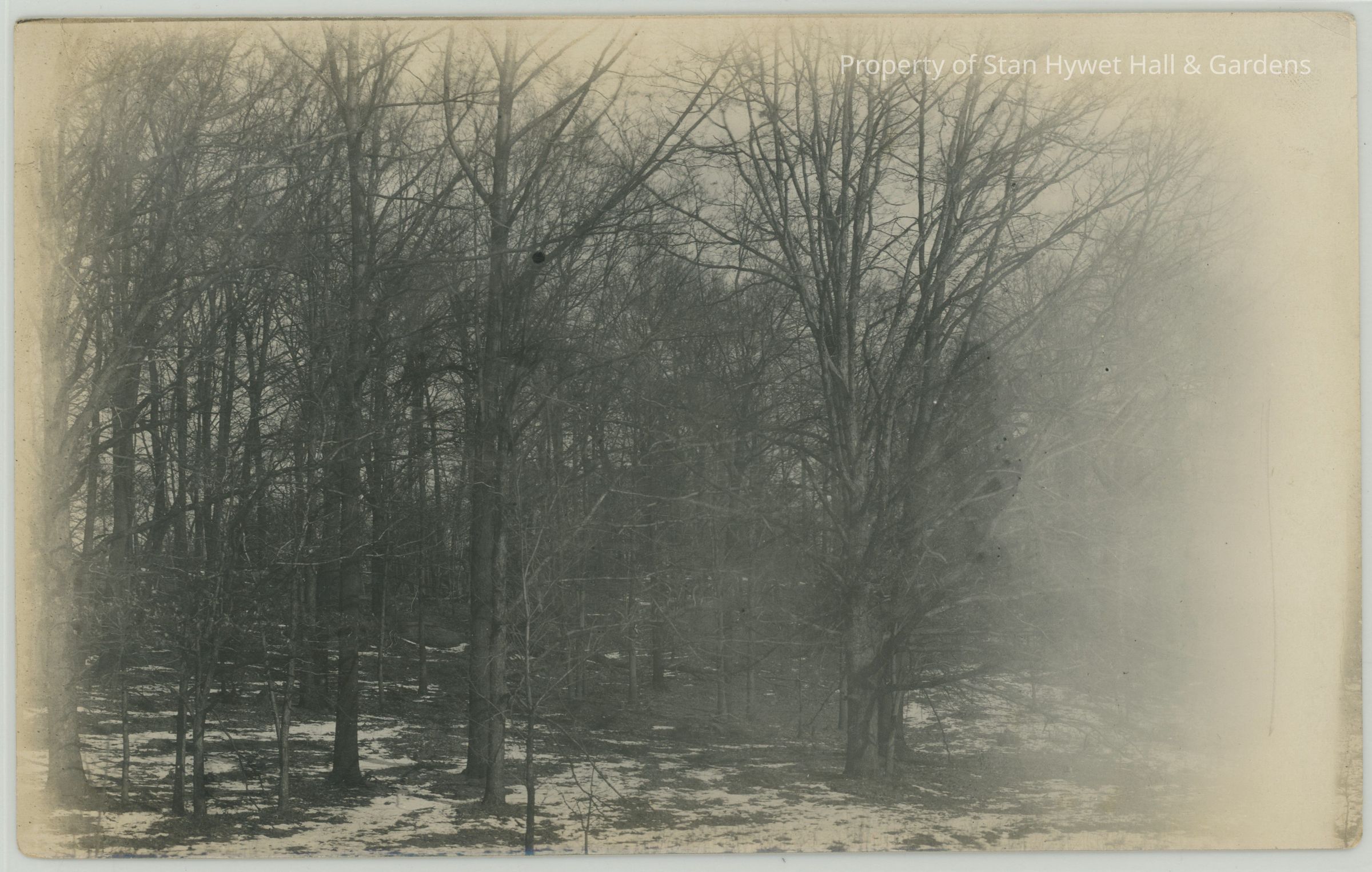 Black and white photograph of a denuded woods. A light dusting of snow is on the ground. The right side of the photo fades out possibly due to overexposure or damagePhotograph Details