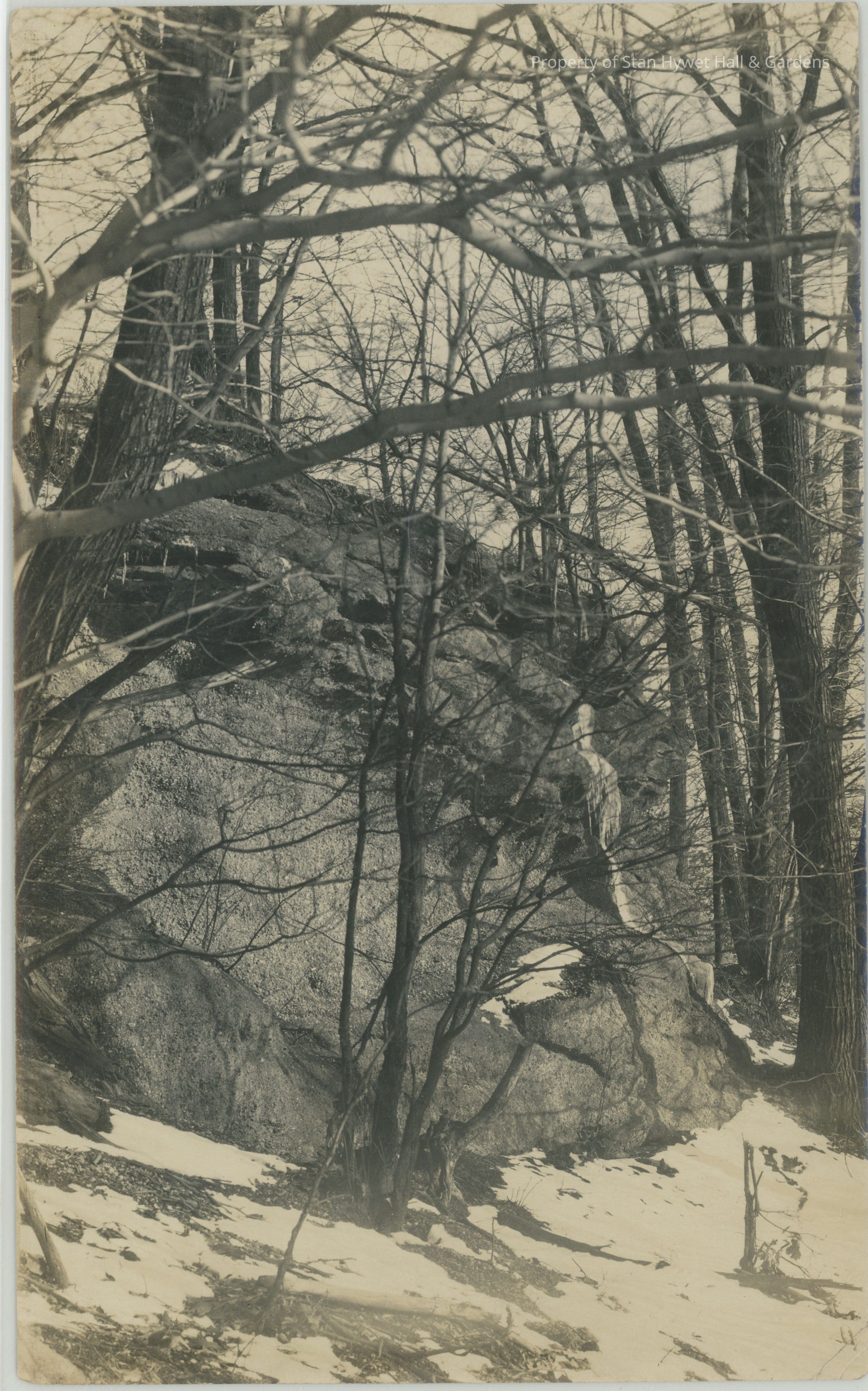 Black and white photograph of snow covered grounds. A very large rock outcropping dominates the photo with trees growing around and on top, possibly from the lagoon area.Photograph Details