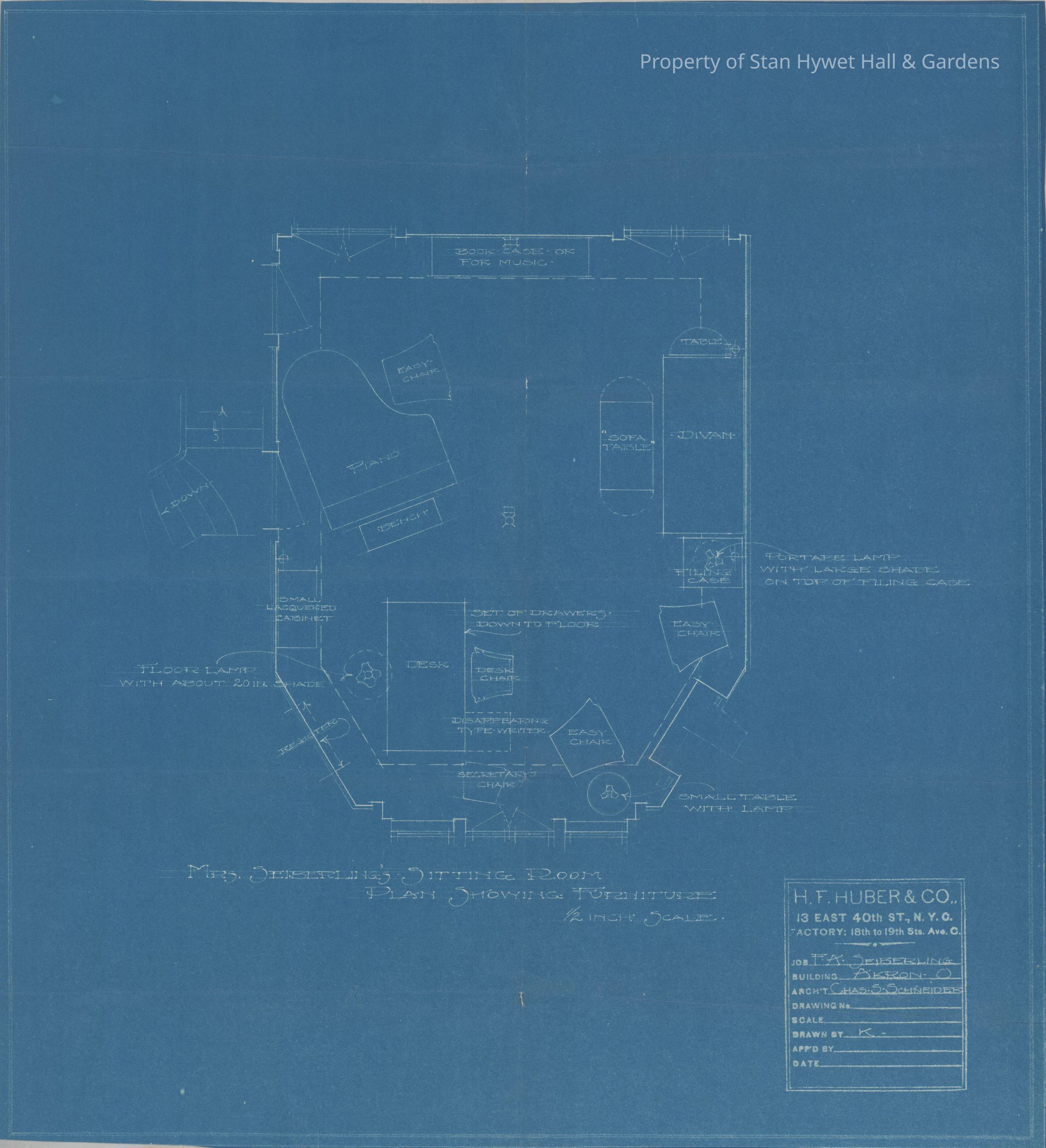 Historic blueprint: Furniture plan for Morning Room in Stan Hywet Hall. Titled "Mrs. Seiberling's Sitting Room Plan Showing Furniture."