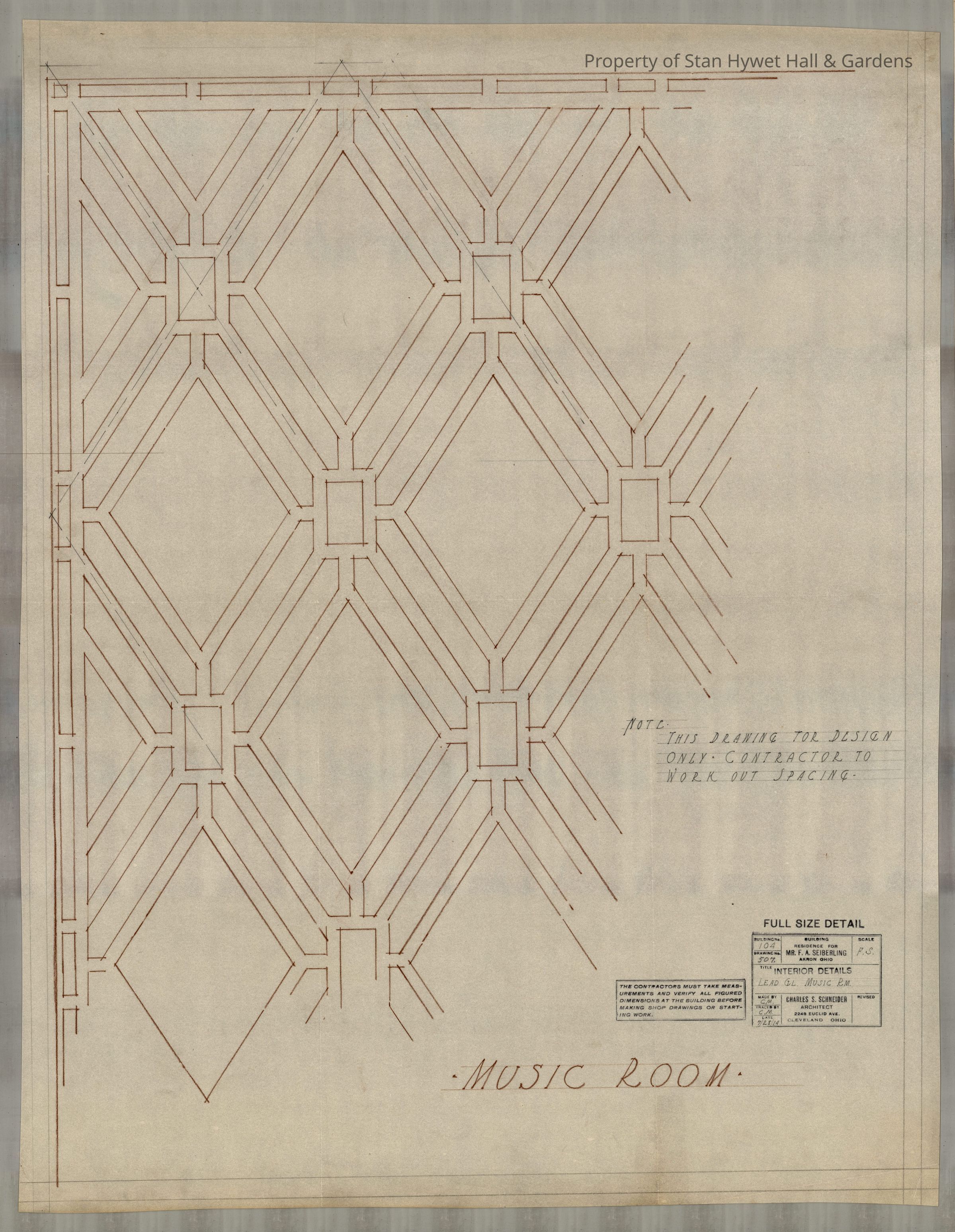 Historic Drawing: Concept drawing of leaded glass window pattern for the Music Room. This pattern was not used. Titled "Interior Details Lead GL. Music Room".