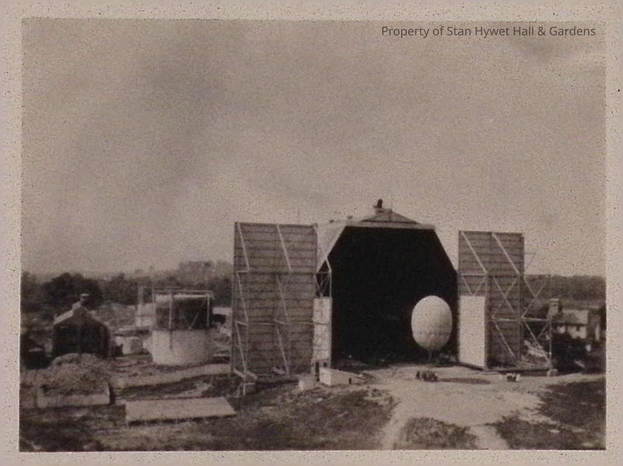 Print developed from gelatin dry plate glass negative. Open hangar at Wingfoot Lake with a light colored balloon visible in the doorway. The balloon is on the ground with people around the gondola. There is a storage tank at left and other buildings visible.Photograph Details