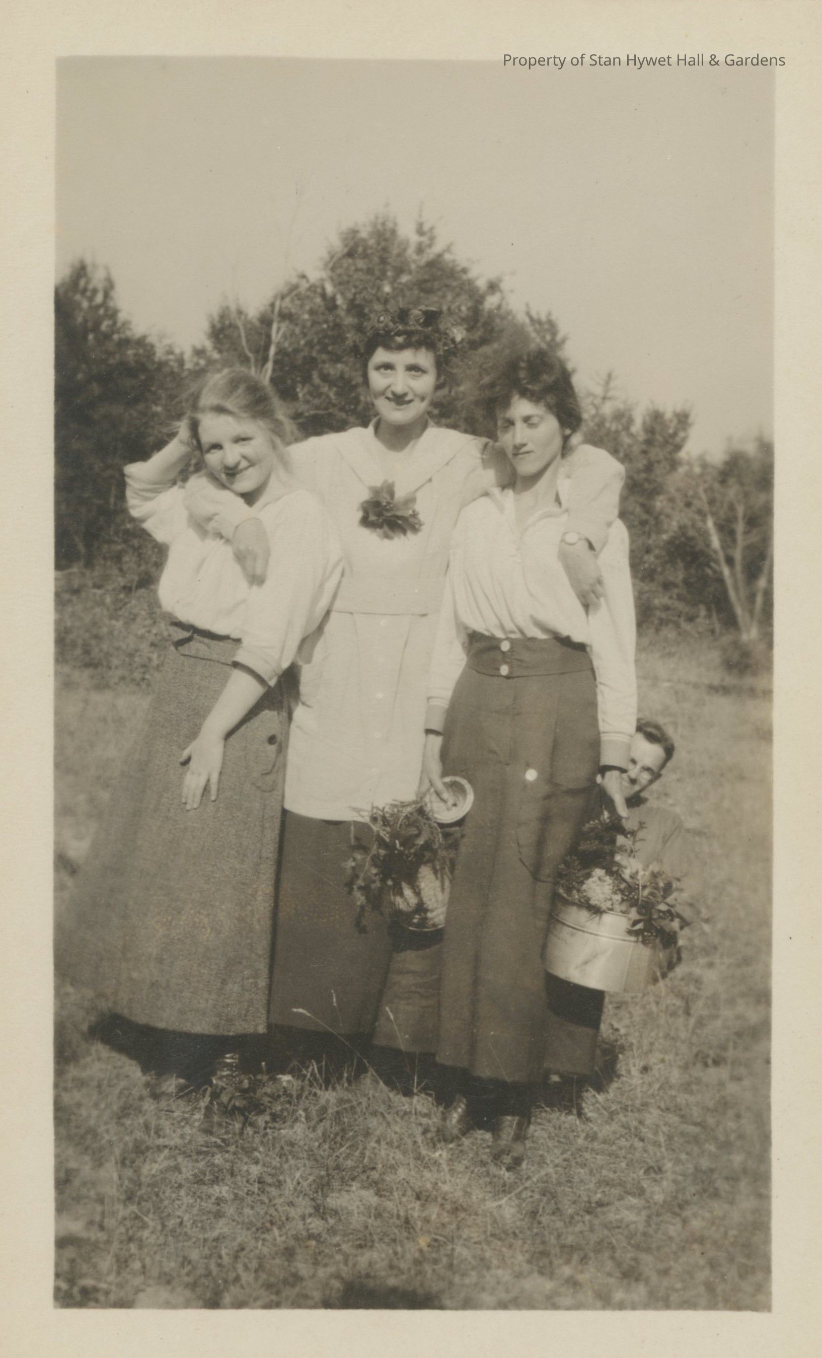 Black and white photograph of three women. Woman on the right, looking down, is holding two metal containers filled with flowers. The woman in the center has her arms around the shoulders of the other two girls and is smiling at the camera. She has prominent dimples. The woman on the left is also looking at the camera. She has one hand raised behind her head and the other hand resting in front of her skirt. Paul Litchfield is seated on the ground peaking around the three women on the right side of the image.Photograph Details