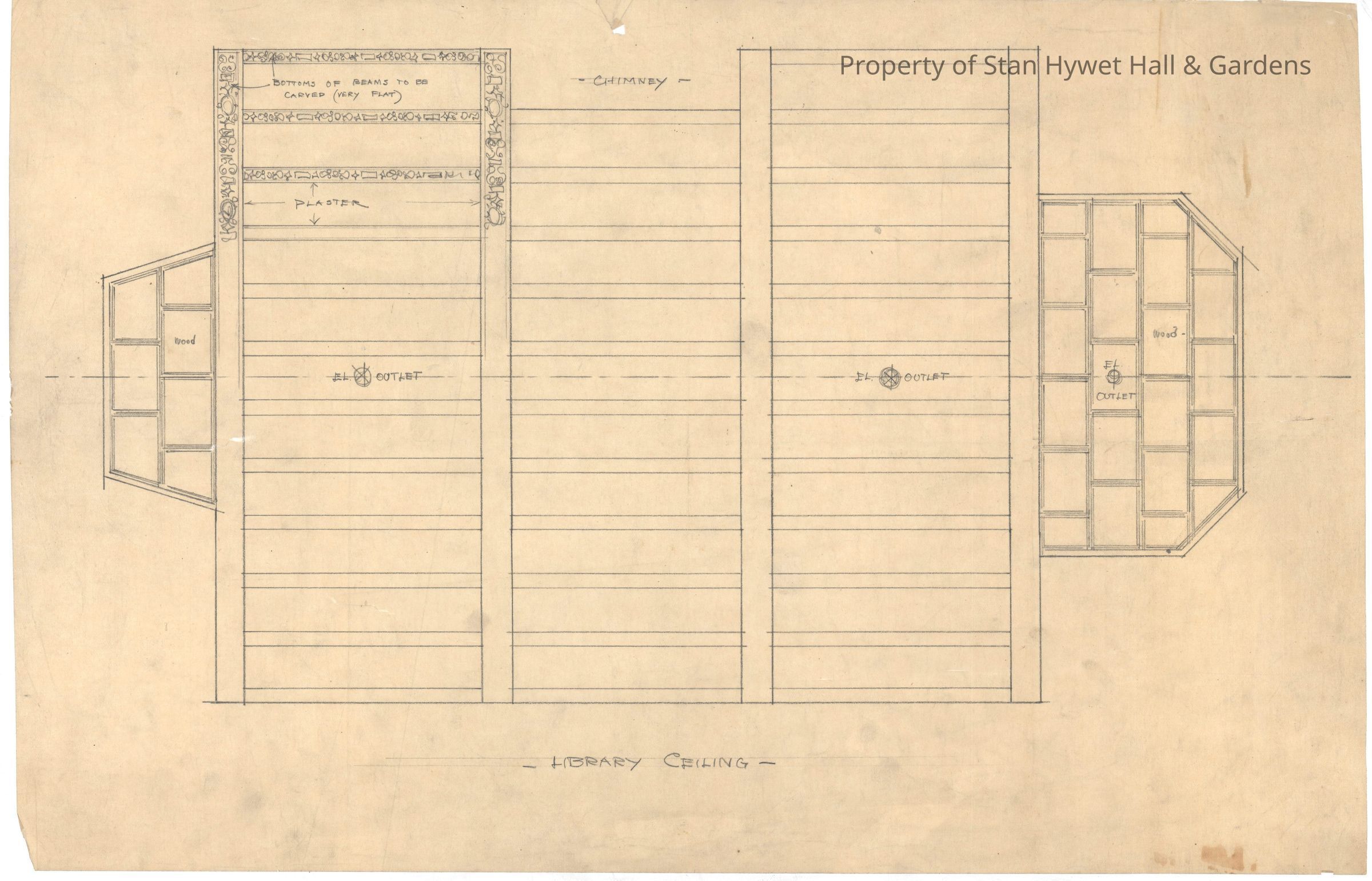 Historic drawing: Drawing of the Library ceiling, including detail of woodwork in top left corner. Titled "Library Ceiling".Collection
