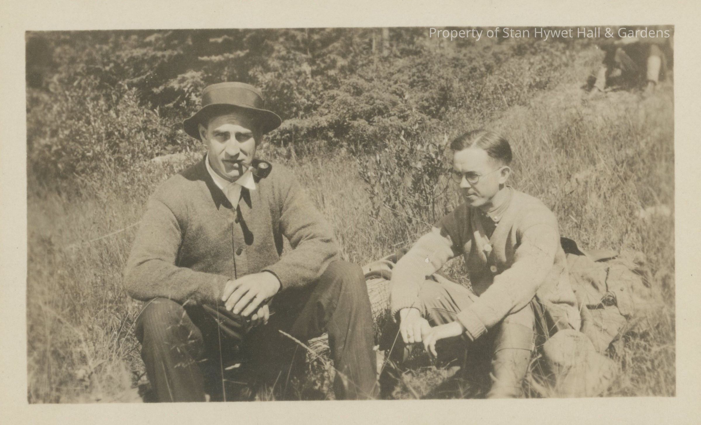 Black and white photograph of three men sitting in grass meadow. The young man on the right, Paul Litchfield, is seated angled toward proper right, looking toward the man seated on the left. He is wearing wire rimmed glasses, a collared shirt and a cardigan. There is also a hat on the ground next to his left leg and a coat or blanket on the ground behind him. His hands are clasped with his arms resting on his knees. To his right is another man in a dark sweater, pants, and a hat. He appears to be seated on a log. He has a pipe in his mouth and he's looking at the camera. Another man can be seen seated on the ground in the upper right corner of the background.Photograph Details