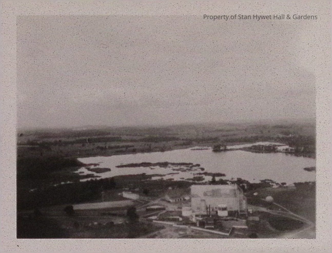 Print developed from gelatin dry plate glass negative. Aerial view of the Goodyear Airdock with one balloon on the ground to the right of the hangar. Wingfoot Lake sits behind the hangar.Photograph Details