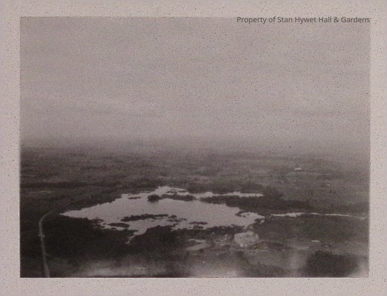 This is a black and white snapshot in the series starting SHH 11.1134. The balloon is much higher and behind hanger. The entire Wingfoot Lake is visable with land in background. At the middle right the blimp is visable. There is a road bed starting at the bottom left edge and going stright up and bending around lake. There is light seepage all along the bottom edge.Photograph Details